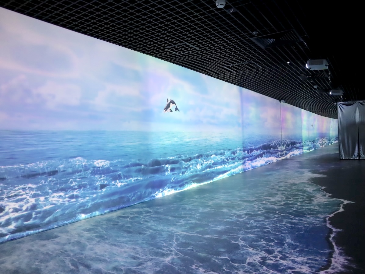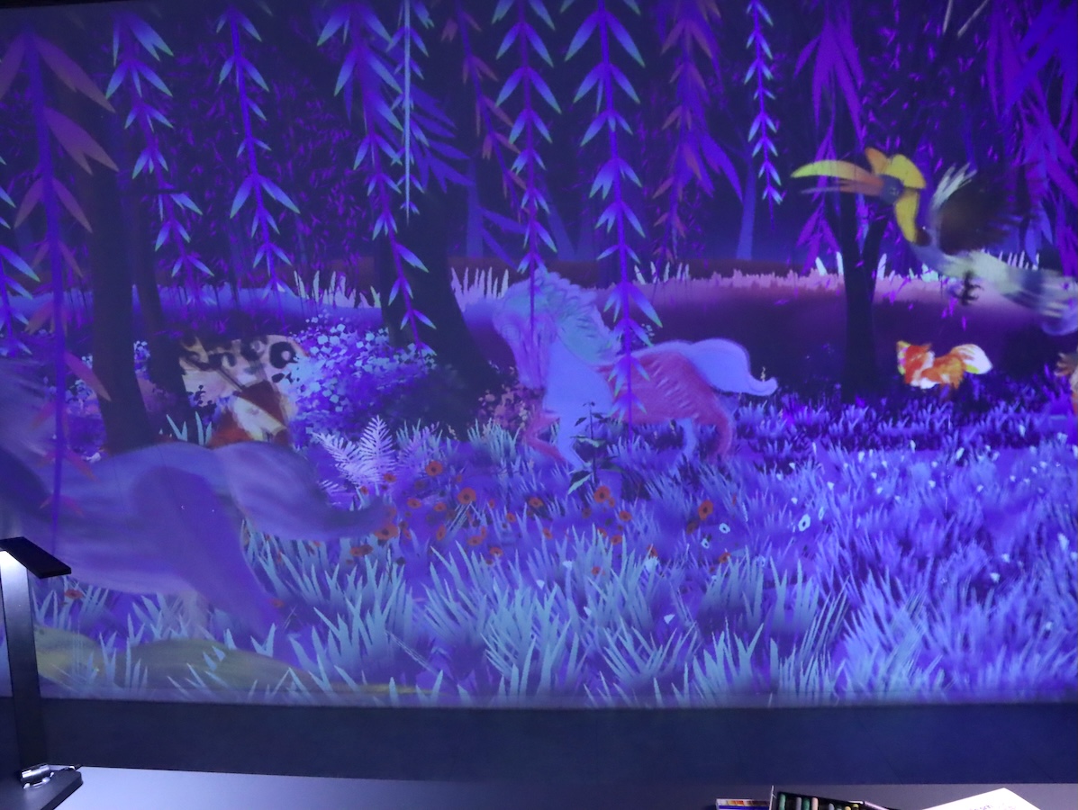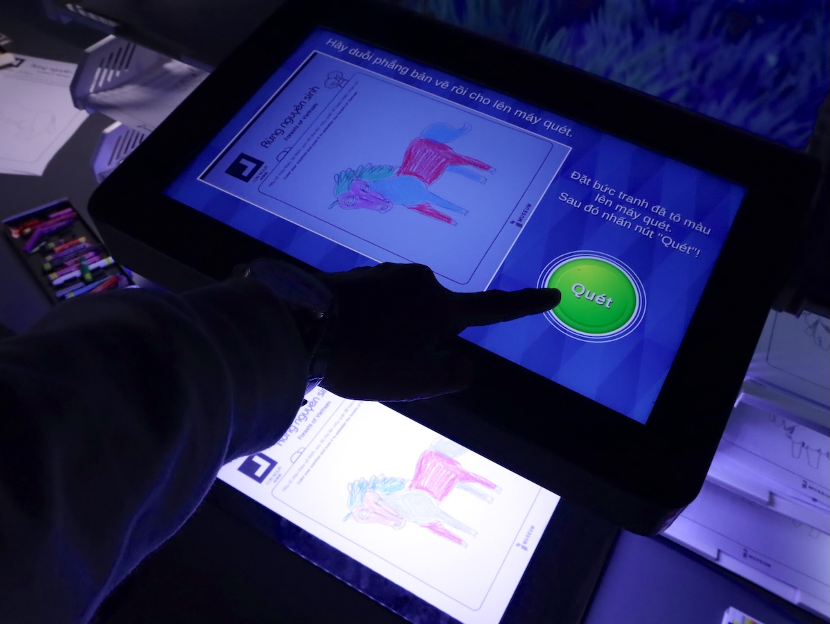 早速、ブースの中へ。それぞれのブースにはテーマがあります。最初は春を感じさせてくれるようなお花畑の演出。きれいだな、とのんびり観ていると、係員のお兄さんから、「ここは前座だから早く先に行って!」と急かされます。次のブースは、以前、特派員ブログでもご紹介させて頂いた、カオバン省のバンゾック滝をイメージした演出。フロアにはいくつものYogibo風のソファが置いてあり、くつろぎながらアート鑑賞ができる…と思いきや、映像の切り替えが早く、効果音も大きいので、アクション映画を観ているような感覚でした。3番目のブーステーマは、ベトナムの海。朝から夜と1日の移り変わりを表現しています。床を通じてリアルな波が足元まで来るように見えるため、友達同士や子どもがいたら、盛り上がること間違いありません。次の“アートギャラリーの部屋”と書かれた場所では、渦に巻き込まれながらゴッホの名画が次々と変わっていきます。ランプシェードが織りなす、ベトナムの空を表現した空間を通り抜け、その先にあったのは、動物の塗り絵とクレヨンと1台のスキャナーでした。好きな色を塗り、それをスキャンするとあら不思議!自分が塗った動物が、目の前のスクリーンで、他の動物たちと一緒に歩いているではありませんか!近くにいた子どもたちも、不思議そうに何度もスキャンして、スクリーンに映る自分の描いた動物を追ってはしゃいでいました。また人間の動きに合わせてスクリーン上のアートが踊ったりと、出口付近は体験コーナーになっているので、子どもだけでなく、大人も十分に楽しめます。