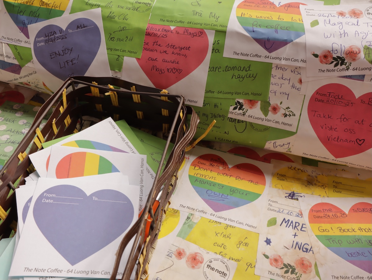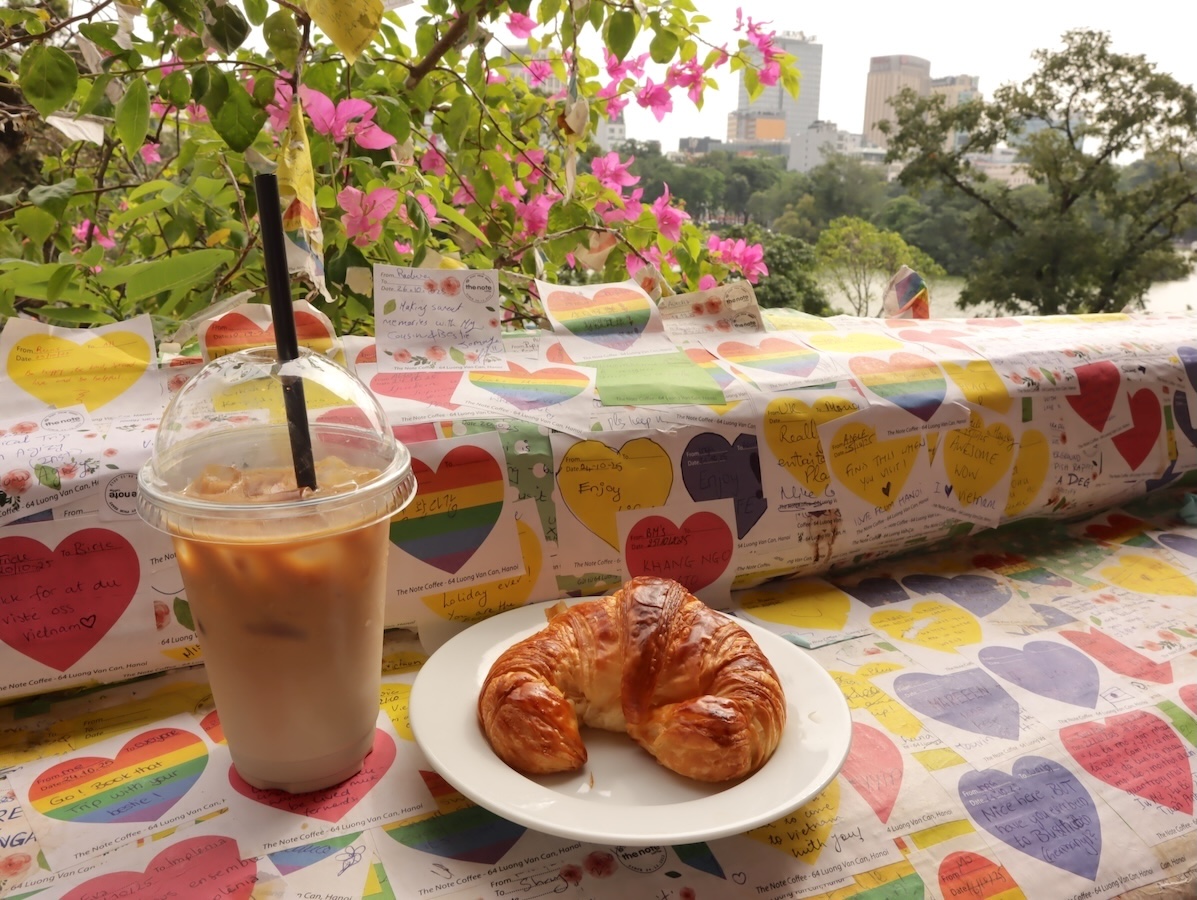 やわらかな日差しの中、アートな空間越しに目の前のホアンキエム湖を眺めながらのカフェタイムは格別。テーブルやカウンターに、ペンと付箋が用意してあり、メッセージを書いて、好きなところに貼ることができます。ちなみにカフェスペースはもちろんですが、階段やトイレも付箋で溢れかえっていました。このカフェに来たら、思い出にアート作品の一部を飾ってみてはいかがでしょうか?