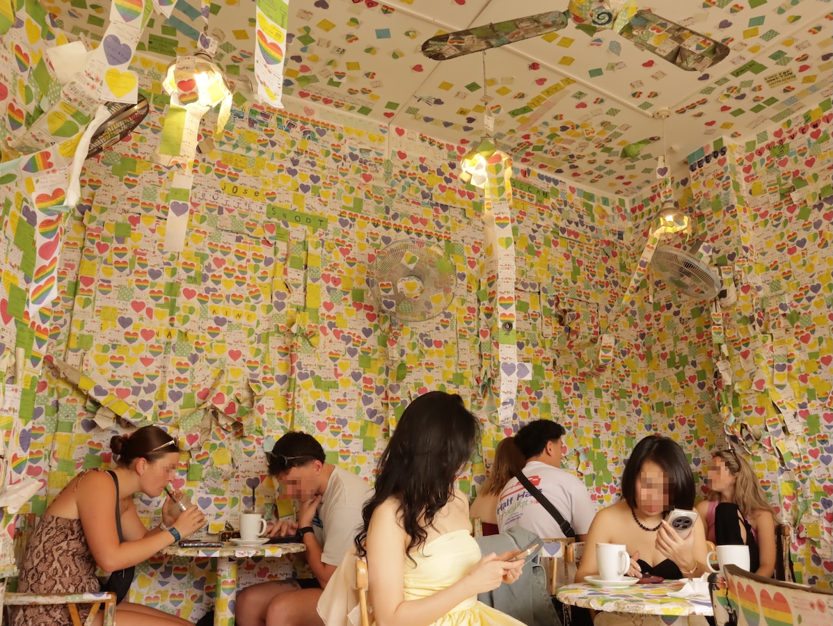 Mơ Art Spaceから徒歩5分ほどの場所歩くと、何やら白壁にカラフルな模様のカフェが見えてみました。よく見ると、模様の正体は、それは数えきれないほどの付箋。これは立派なアートです。
