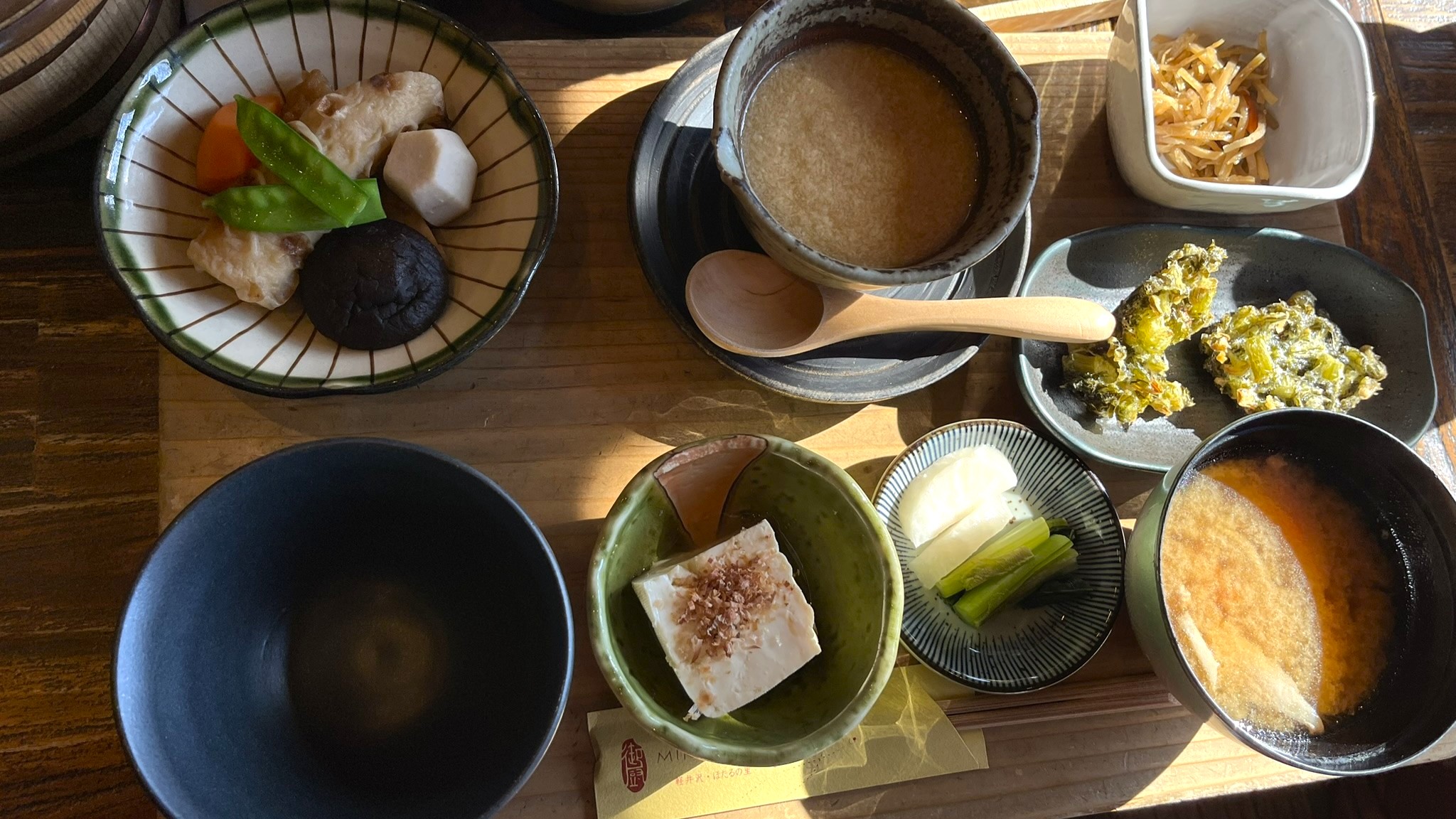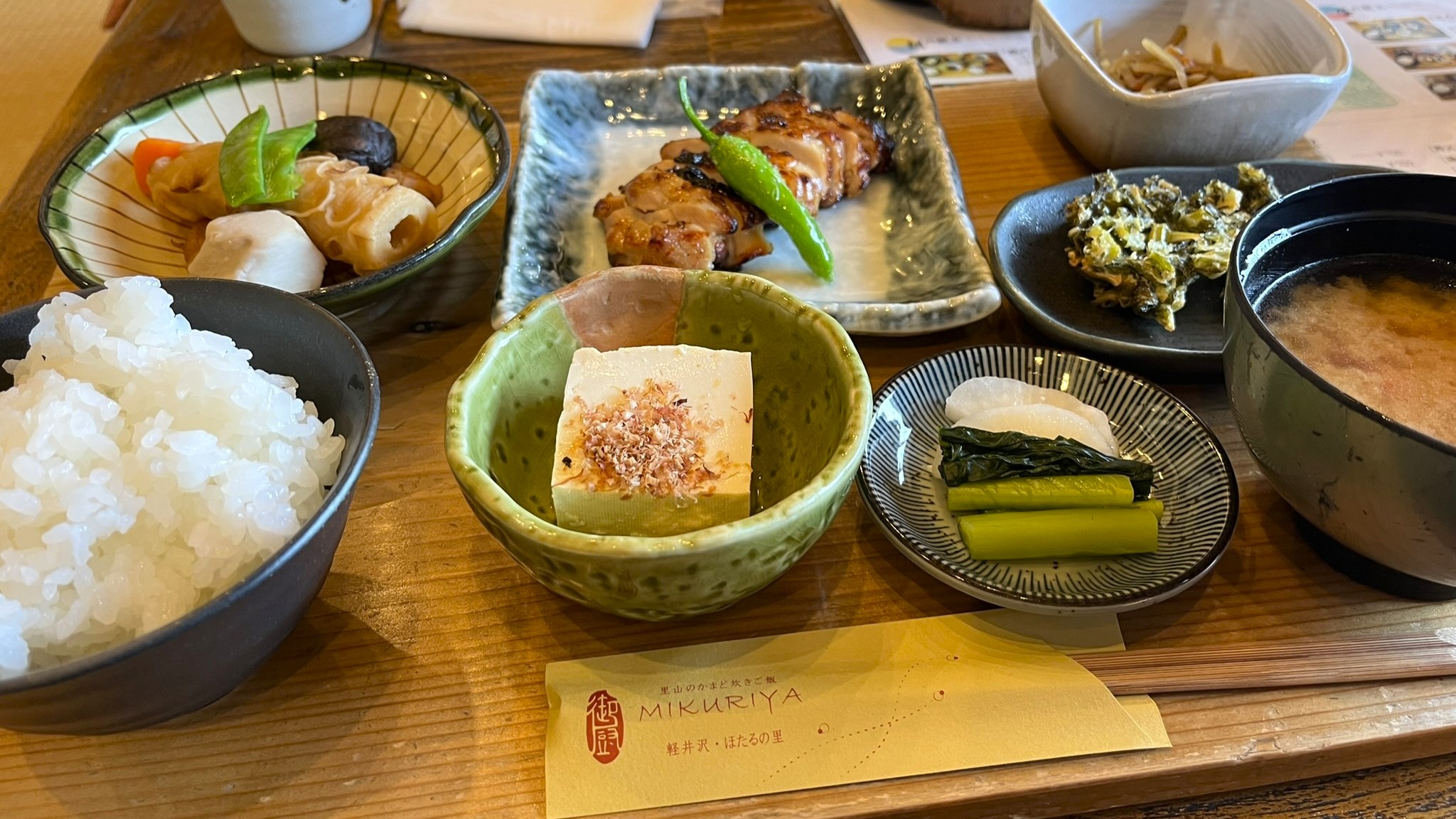 お昼は三種類から選びます。わたしは「鶏の味噌漬け焼御膳」どれもかまどで炊いたご飯がよりおいしくなるおかずばかりです。鶏はもちろん、美味しいのですが、おすすめは野沢菜の天ぷら。美味しいので是非食べてみてくださいね。他にはとろろ汁御膳と鯖味噌御膳があります。