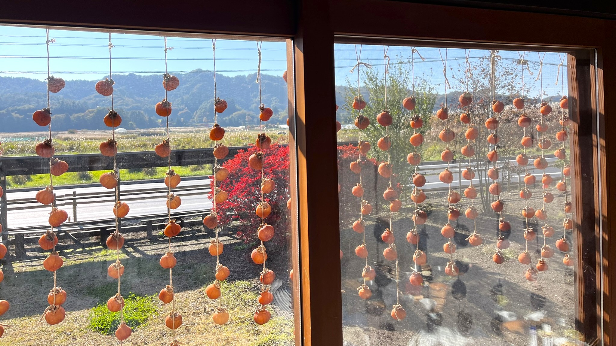 窓の外には干し柿が吊るされていました。ほのぼのとした景色を見ながら。美味しいごはんが楽しめます。予約しないと入れないと思いますので、必ず予約して来てくださいね