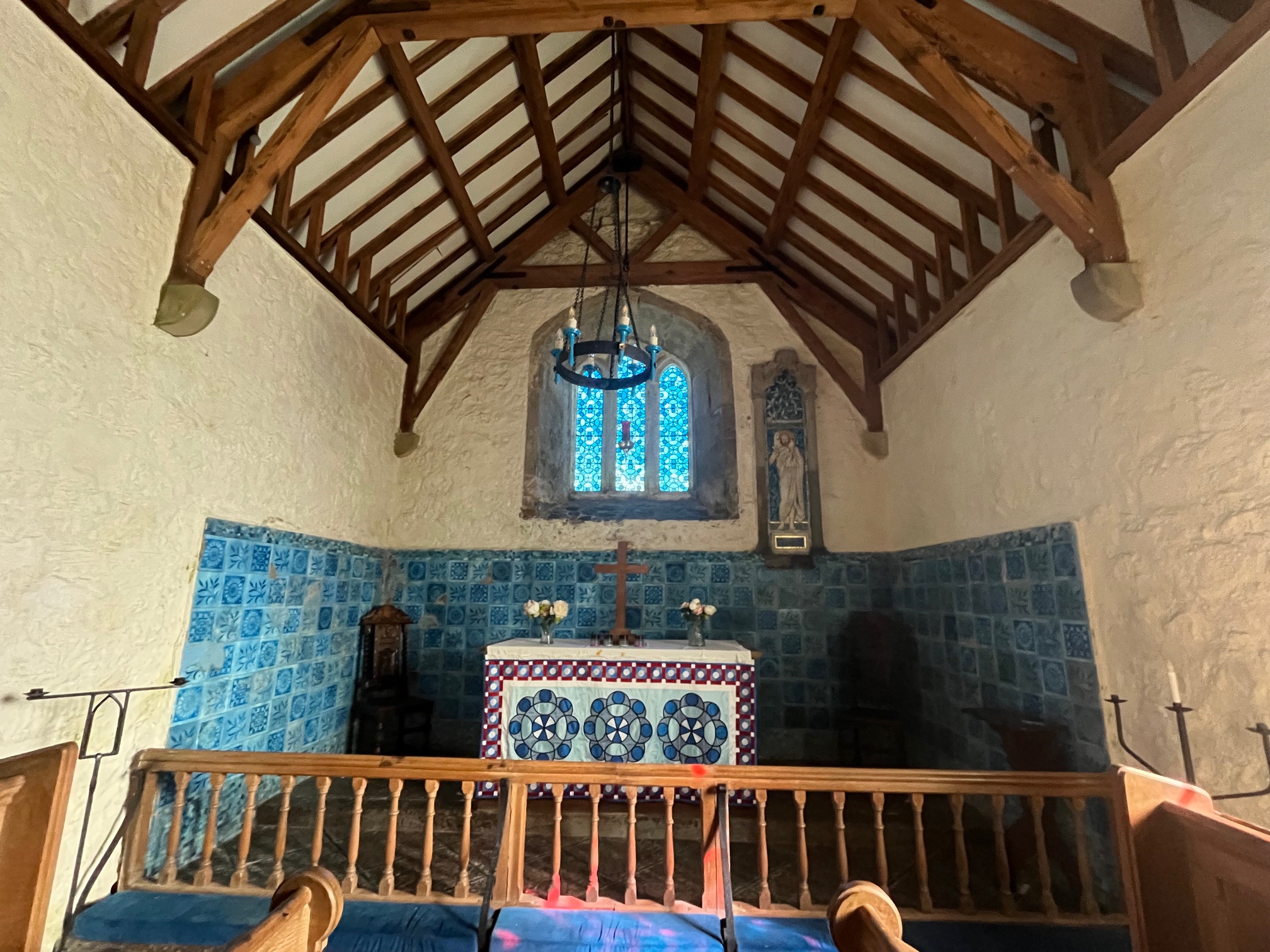 いかにもウェールズらしいスレート屋根の見た目は素朴な石造りの教会ですが、内部は意外にも華やかで、祭壇にはイスラムやムーア様式の影響を受けたタイル装飾が見られます。