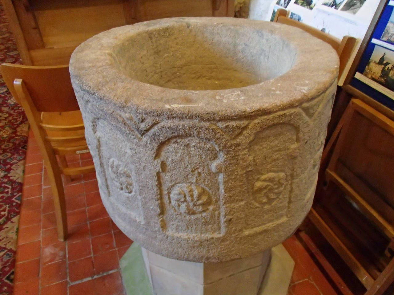 現在の建物は12世紀頃に再建され、19世紀に修復を経て現在の姿になりましたが、石造りの外壁や洗礼盤は当時のものとされてます。