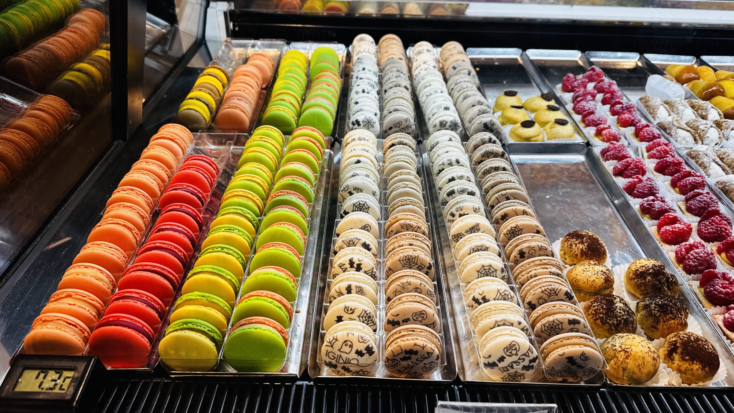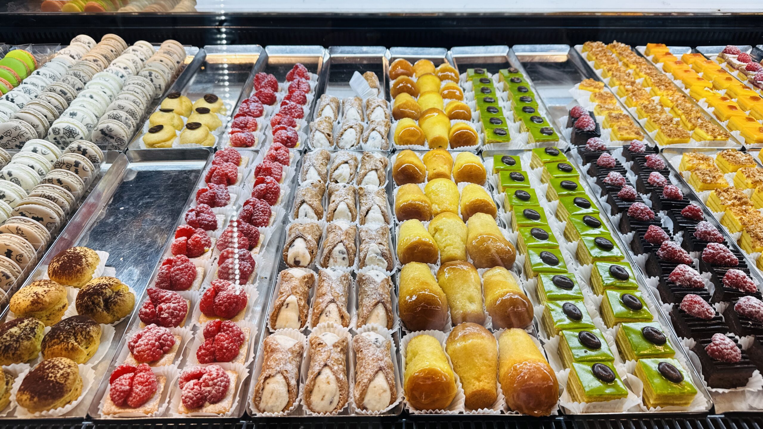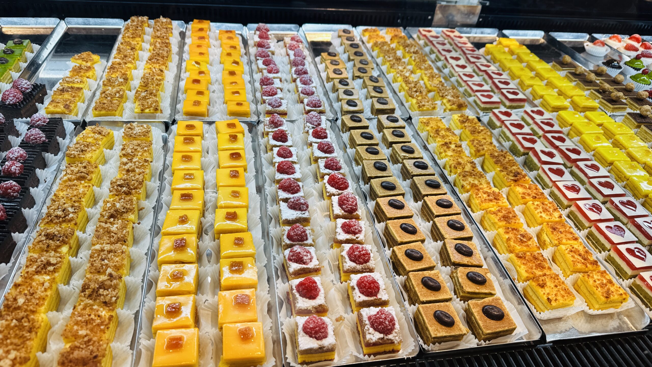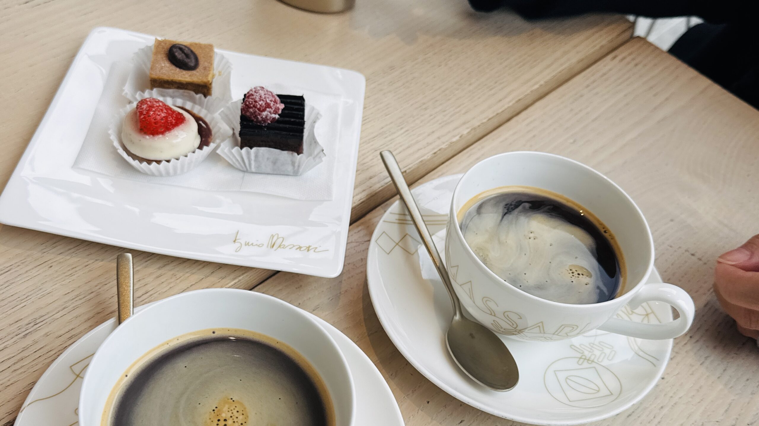 お買い物の途中でドゥオモの近くのIginio Massariで コーヒー休憩。ここはイタリアでマエストロ・デ・マエストリと称されるパティシエ、Iginio Massari氏が手掛けるブランドの店で、ケーキのおいしさはピカイチです。スイーツがまるでアート作品のように並んでいて、選ぶのも楽しいです。いつも混雑していているので、サクッと食べるくらいで行くのがちょうどいいです。