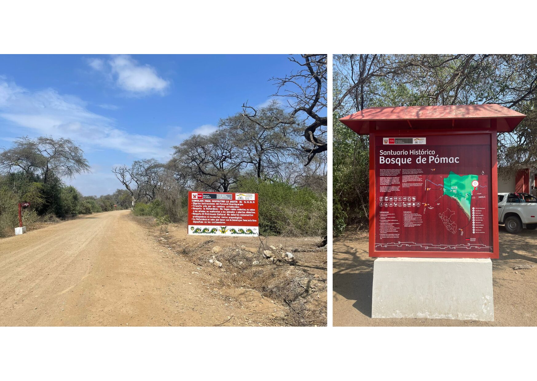チクラヨの中心地から「ポマの森」の入り口となるビジターセンターまでは約50㎞、車で約1時間20分ほど。最も手軽なのは、ツアー会社やタクシー(チクラヨではUberも利用可能)を利用する方法です。コストを抑えたい場合は、コンビと呼ばれる乗り合いバンもおすすめ。チクラヨの停留所から入口付近までは片道6~7ソル(約240~280円)ほどで行けます。(Bosque de Pómac / Batán Grancde / Santa Clara行きのうちのどれか)乗車の際に運転手にBosque de Pómac(ボスケ・デ・ポマック)と降車希望を伝えれば、入口近くで降ろしてもらえます。コンビの乗り方については、過去のブログにてご紹介しているのでチェックしてみてください。