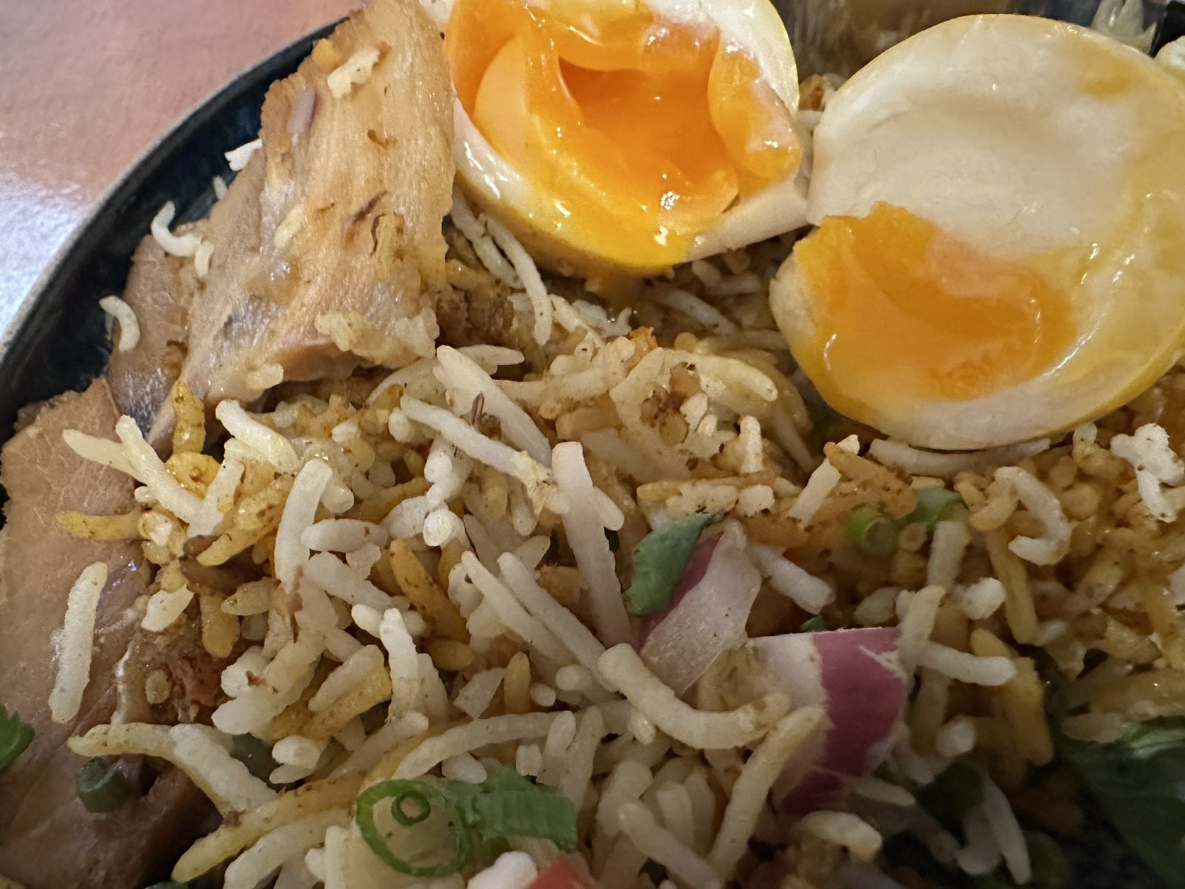 看板メニューのビリアニは豚骨スープで炊き上げ、香り高いスパイスと奥深いコクが特徴。副菜を少しずつ混ぜることで、味の変化も楽しめます。