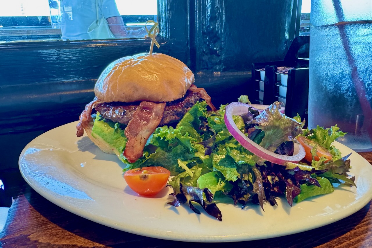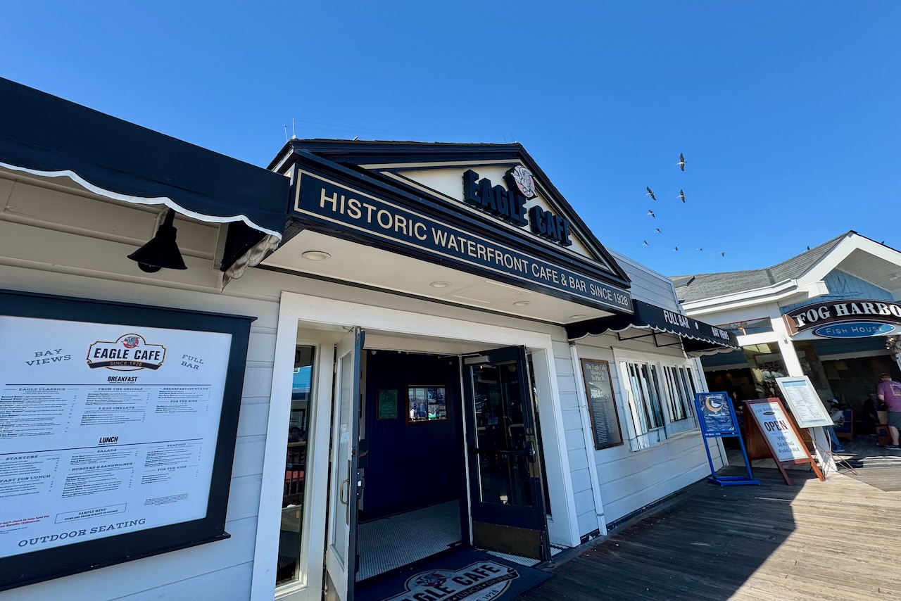 ピア39は、フィッシャーマンズワーフを訪れたなら誰もが一度は足を運ぶ場所。桟橋の先まで歩けば、目前にアルカトラズ島が浮かび、Kドックにはアザラシたちが気ままに寝そべっている。見渡せば観覧車が回り、観光客の笑顔が揺れる。そんな賑わいの裏で、この場所がかつて冴えない埠頭だったことを知る人は少ない。1978年、開発者ウォーレン・シモンズが「港ににぎわいを取り戻そう」と再開発を進めたとき、最初に入った店のひとつが「イーグルカフェ」だった。創業は1928年。店内の壁には軍艦のキャップがずらりと飾られ、港町としての歴史が静かに息づく。王道はクラムチャウダーやダンジネスクラブだが、今回はあえてハンバーガーを注文(苦笑)。肉汁たっぷり、サラダも新鮮で◎。ベランダ席から眺めるゴールデンゲートブリッジは、変わりゆくピア39の中でもしっかりと風景になっていますね。