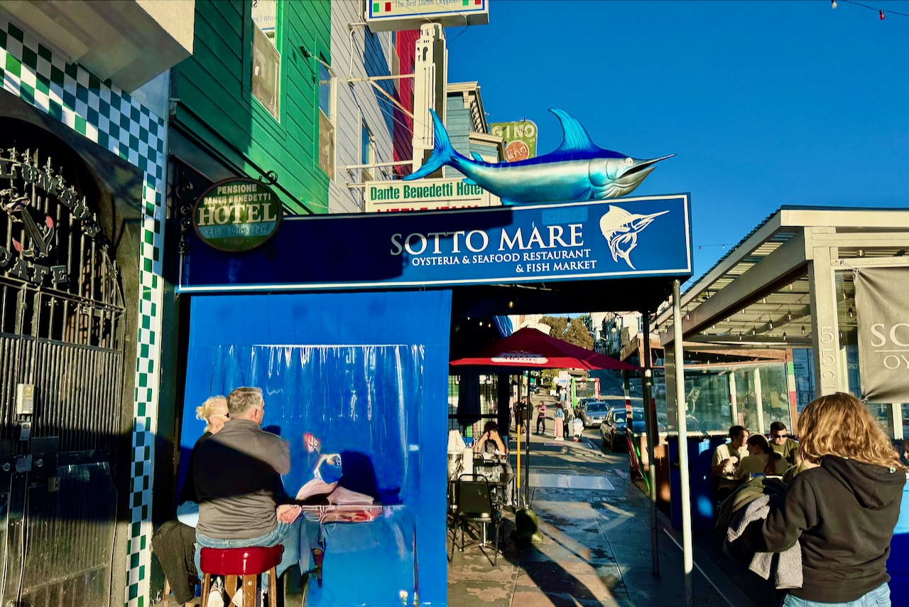 リトルイタリーで老舗シーフードレストランの一つが「ソットマーレ」。目をひく青い外壁が目印。イタリア系漁師の魂を今に伝える店です。看板メニューはサンフランシスコ名物「チョッピーノ」。19世紀末、イタリアから移住した漁師たちが“釣れなかった日”仲間に「Chiò! — 少し分けてくれ!」が語源らしい。飲食店でお客に出せない規格外の訳あり食材で作った賄い料理になって(フードロスを無くすアイディアね)。今じゃイタリア系レストランの看板メニューになりました。トマトベースのスープに、ムール貝、エビ、カニ、そして白身魚がごろごろ。このごった煮感は寒風の中で火を囲んだ漁師たちがハフハフしながら食べていたんだろうなぁと思います。ノースビーチの観光地化の波を越えて、“港町サンフランシスコ”がまだ確かあります。2〜3人前あるのでシェアしてどうぞ!