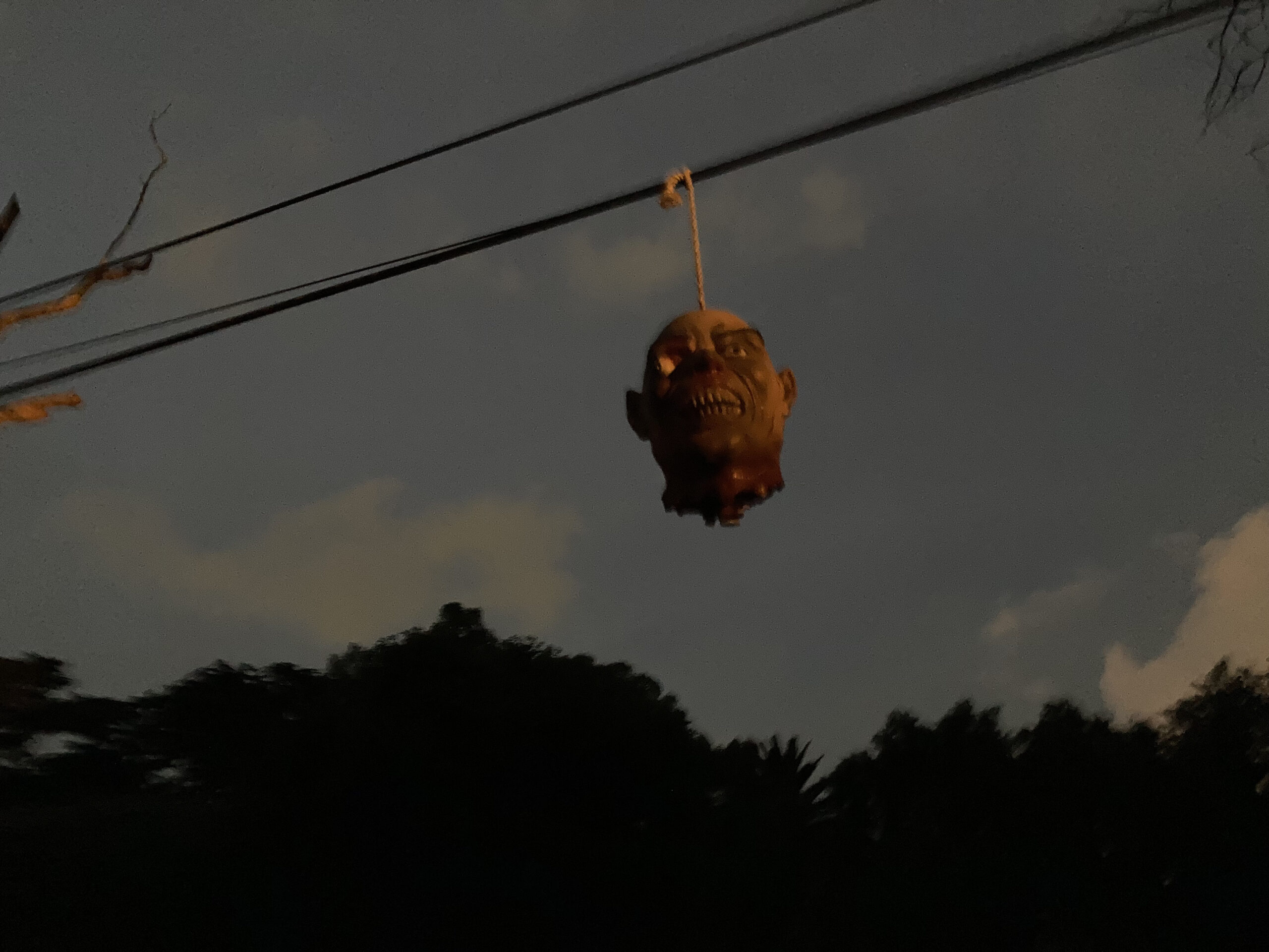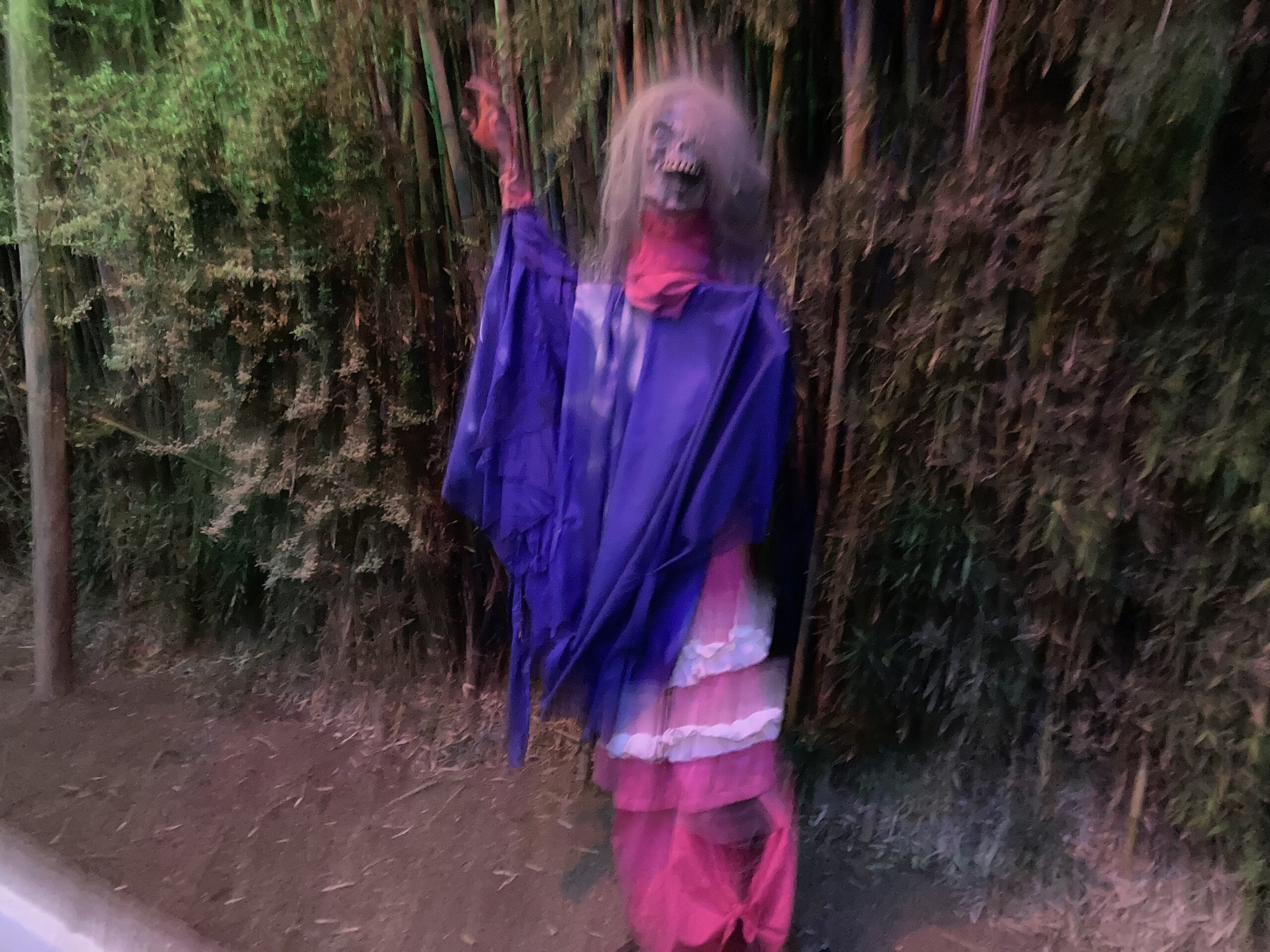 壁やフェンスにお化けが括り付けられていたり、電線から首がぶら下がっていたりとハロウィンらしい装飾があちこちにあります。ゲストはそれらを眺めながら園内を歩いて各スポットを巡ります。
