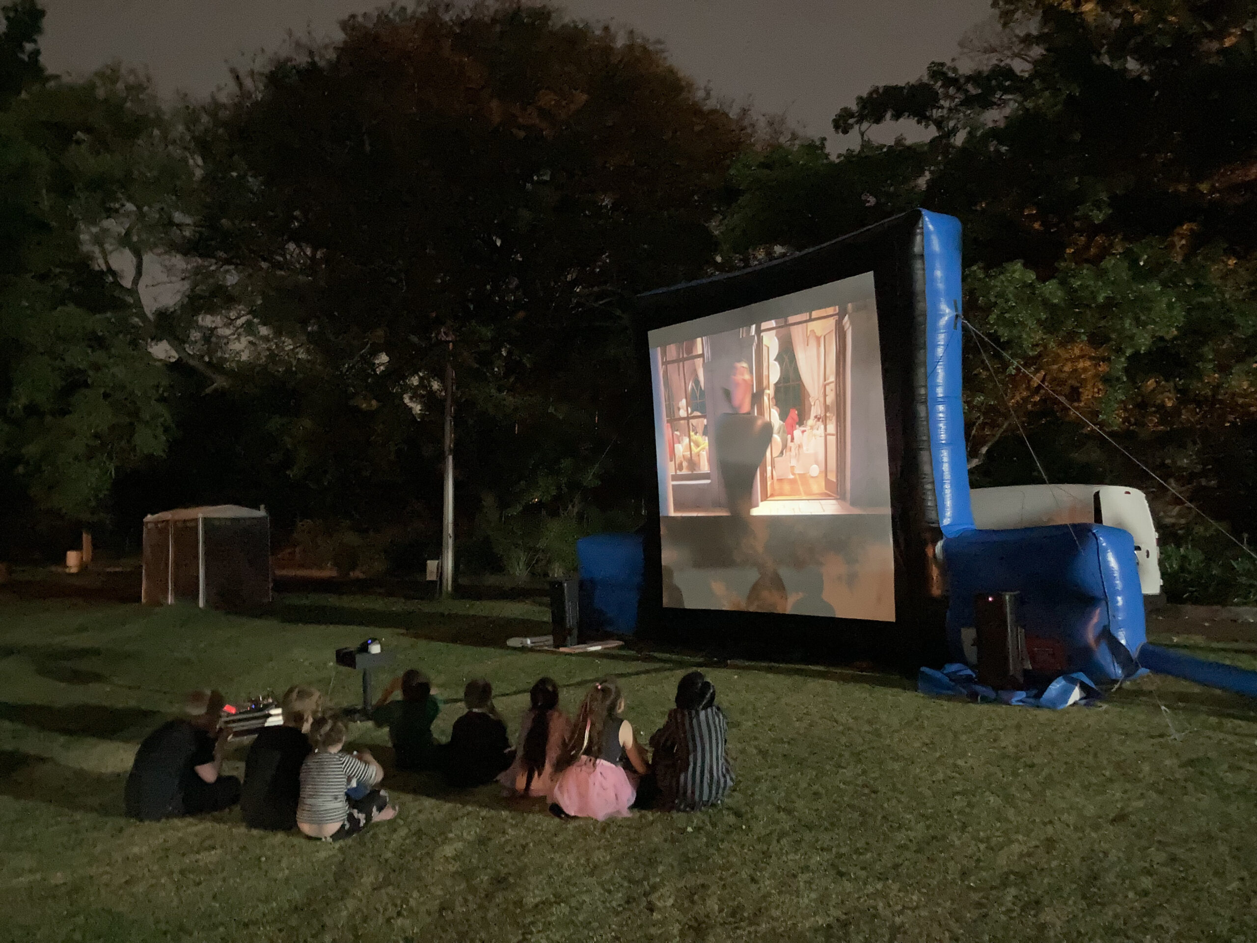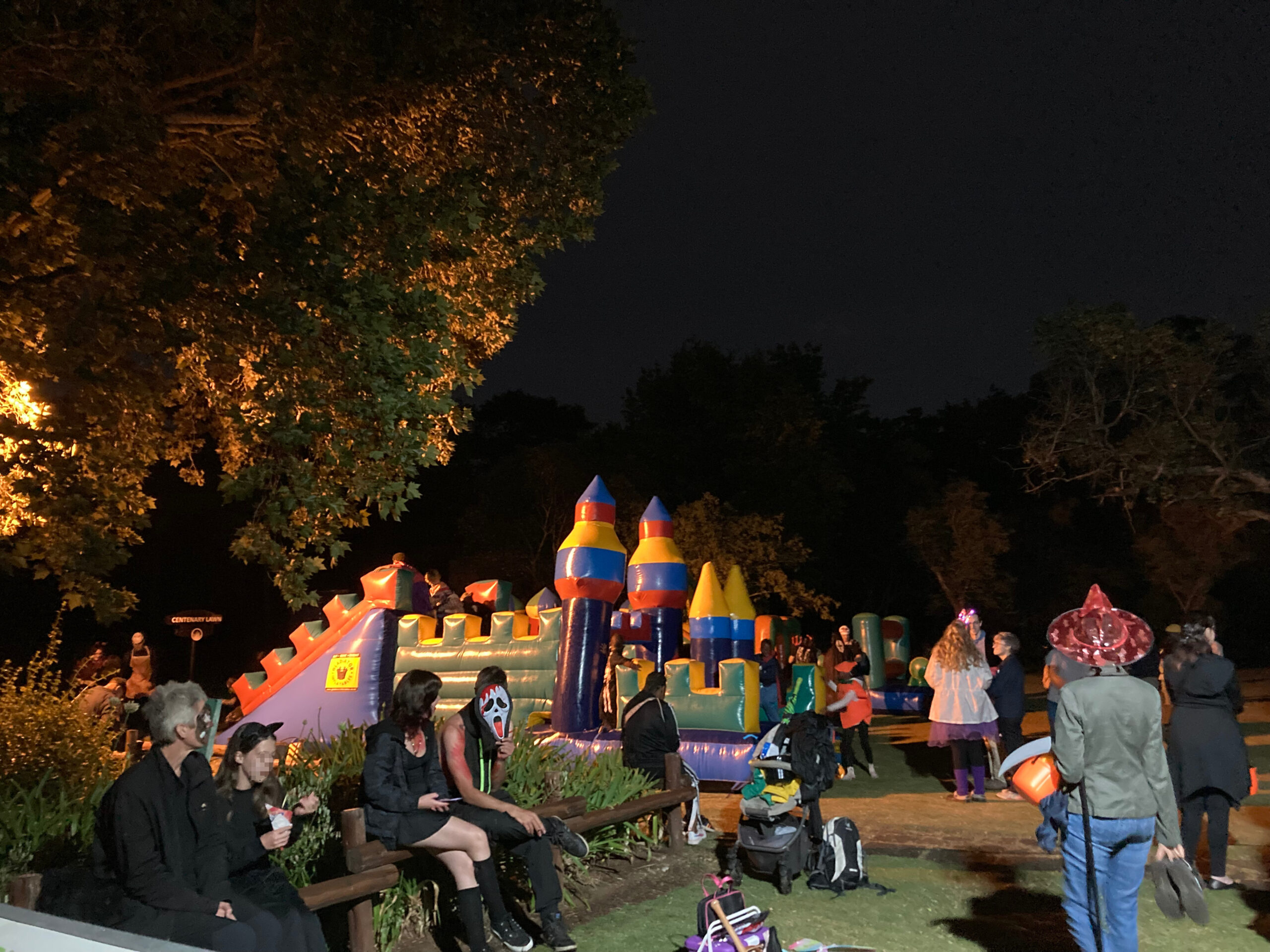 最後はキッズエリアです。仮装した子供たちがジャンピングキャッスルで遊んでいました。野外シネマコーナーもあり、ハロウィンらしい映画が上映されていました。