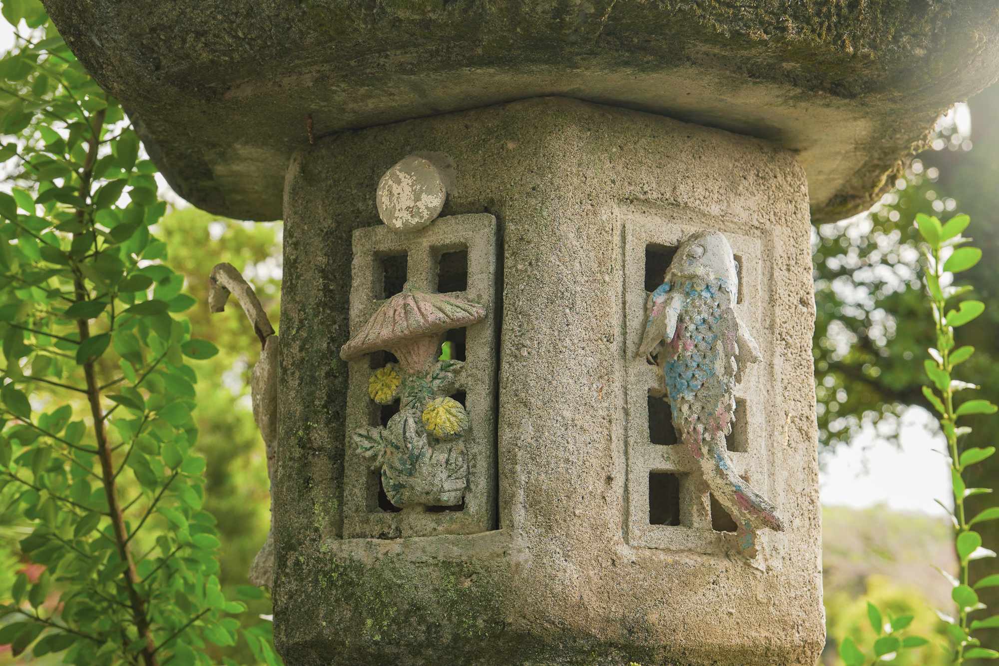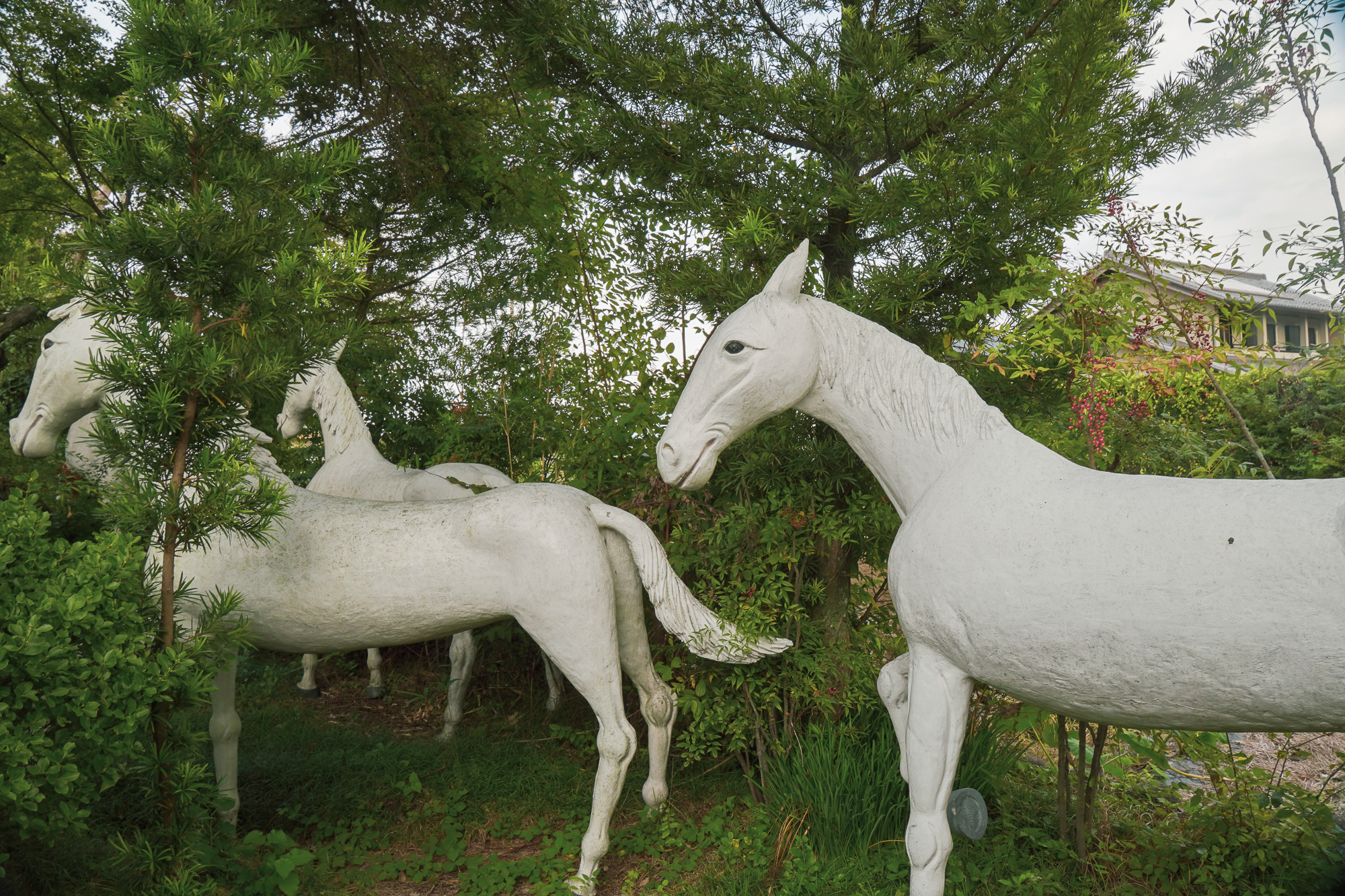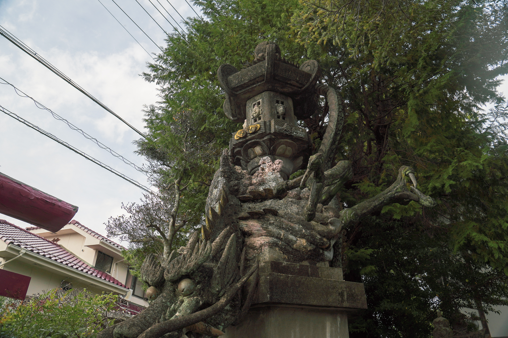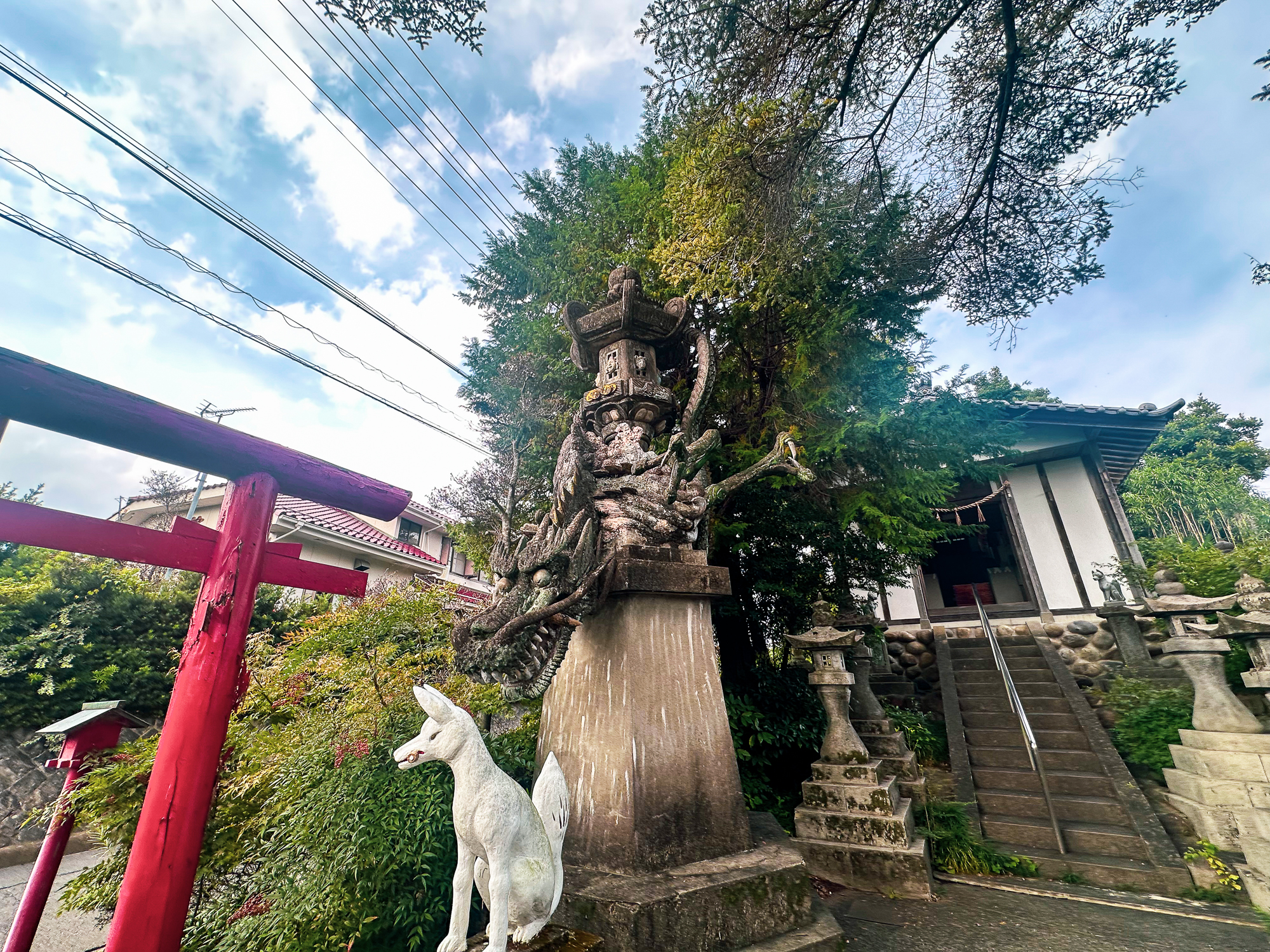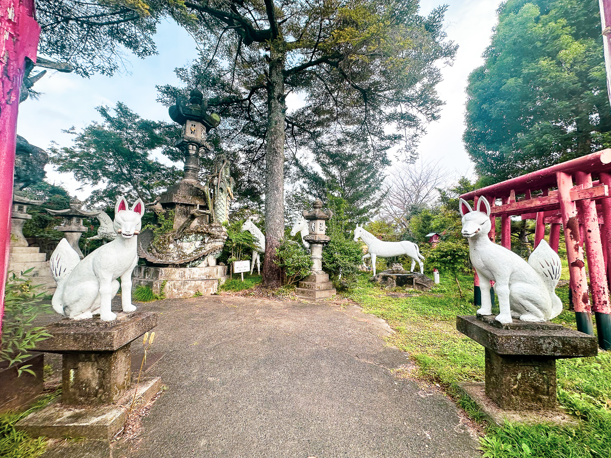 境内には、白い神馬像や狐の像、左右で形の異なる龍が巻き付いた灯籠など、独特の雰囲気が漂います。
