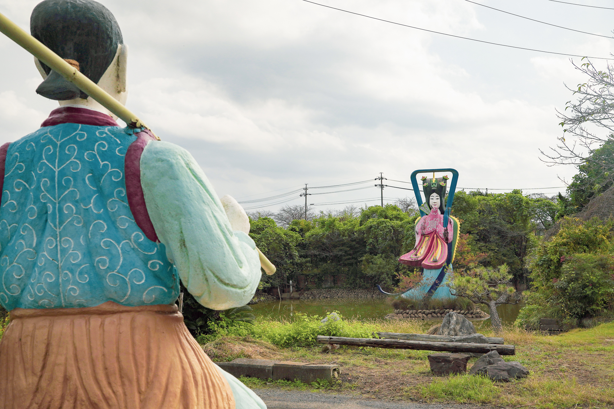 公園はお隣の海津市との境にある大榑川堤防近くにあります。池の中には、高さ10.4メートル(ビル3~4階相当)の巨大な乙姫さんの像が。今から約60年前、地元の建設会社「日八工業」の当時の社長・牧野柳平氏が私財を投じて建立したものだそう。つまりこの公園、私有地なんです。