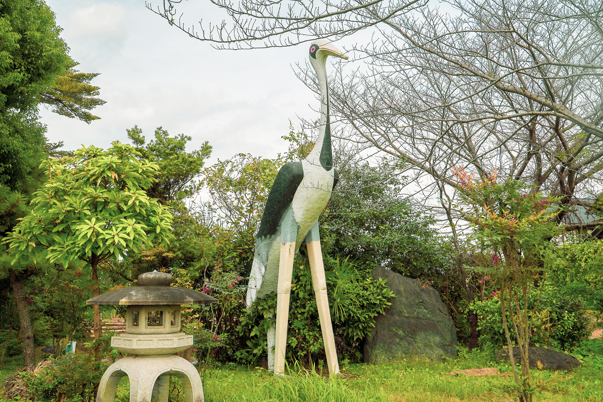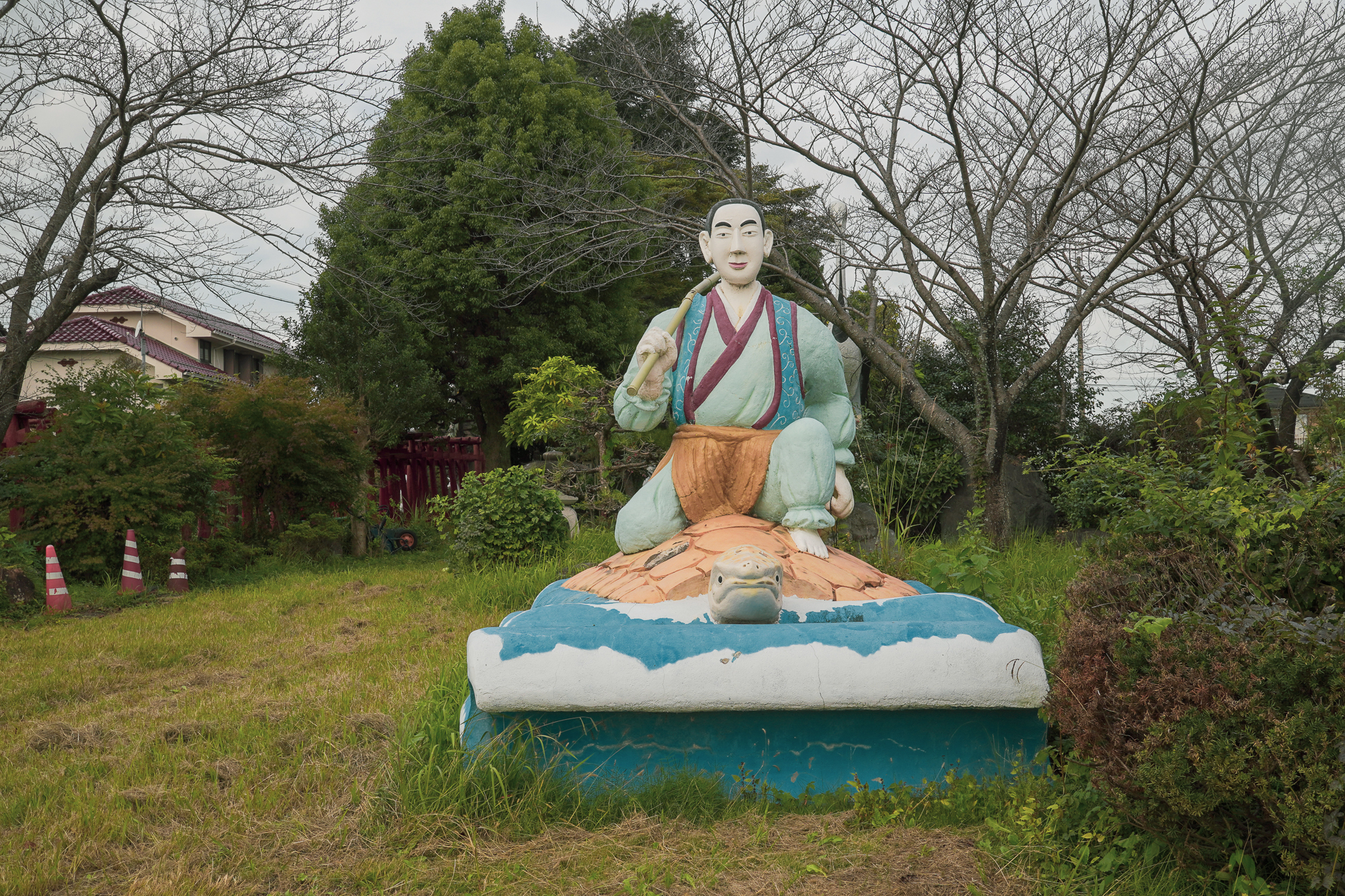 乙姫さんと見つめ合うように浦島太郎の像が立ち、その背後にはなぜか巨大な鶴の像も。なぜ鶴なのか・・・?ミステリアスな構図が、訪れる人々の好奇心をくすぐります。
