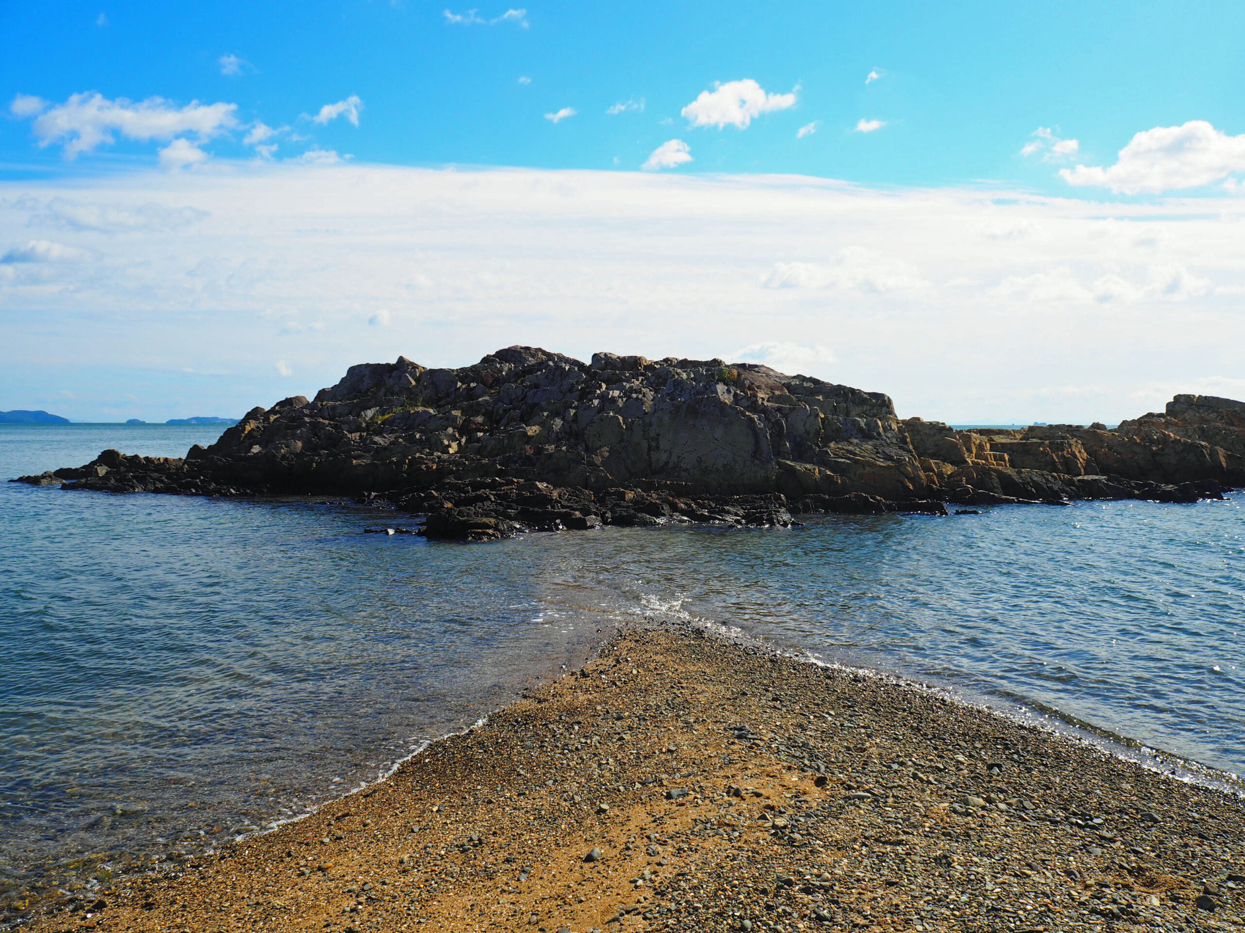 トンボロ現象とは、干潮時に海底の浅瀬が出現し、普段は海で隔てられている陸地と島等がつながる自然現象です。