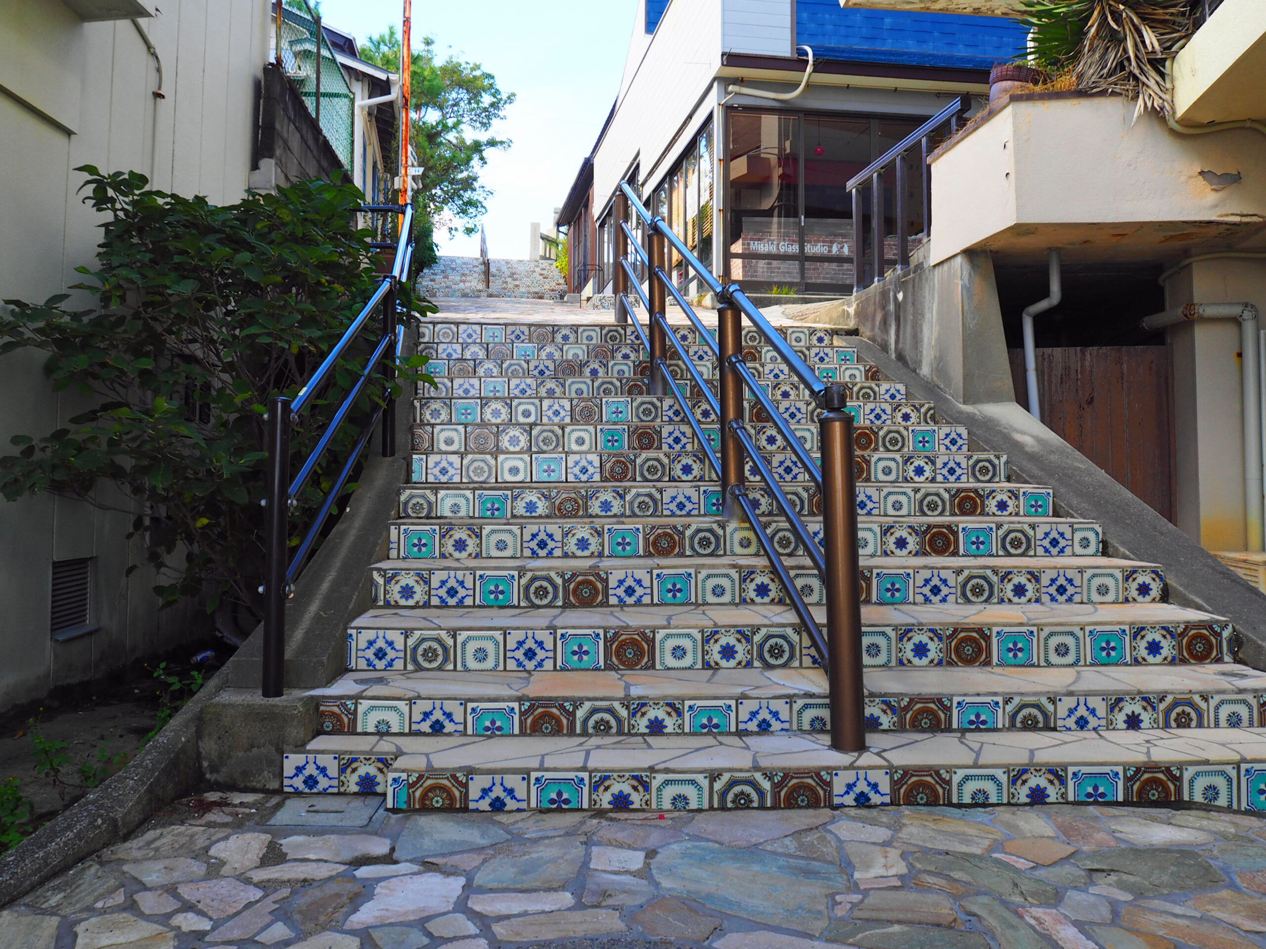 下から階段を見上げます。階段の蹴上げに使われているタイルがノスタルジックな雰囲気で素敵でしょう。マジョリカタイルでしょうか?