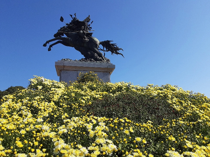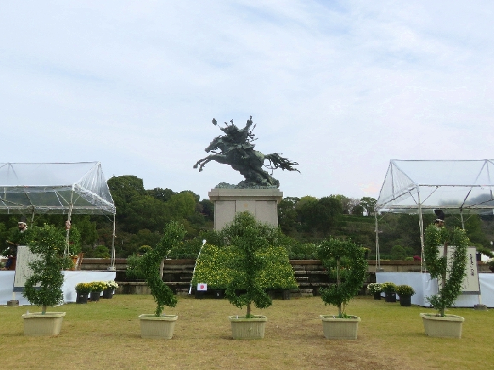 青空の下で映える菊池市のシンボル的な「菊池武光公騎馬像」手前に”きくまつり”の文字を菊で表現というアイデア! 残念ながら菊は開花していませんでしたが開催期間中に鮮やかに彩る”きくまつり”を見ることができたらいいですネ。