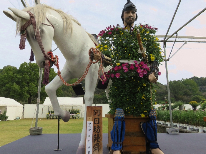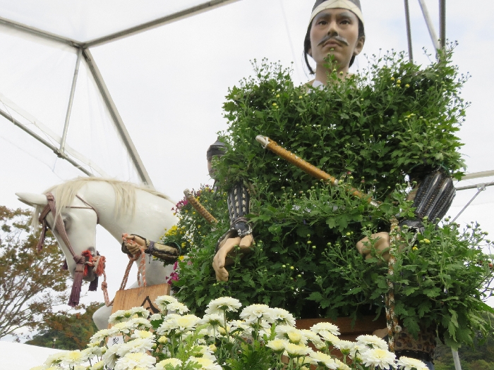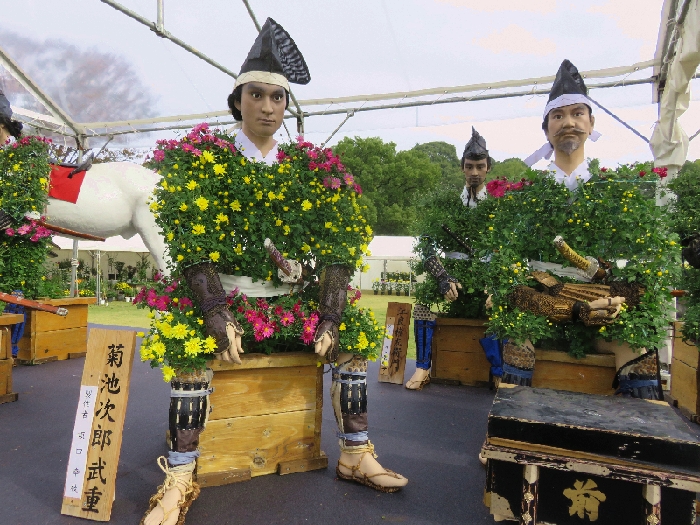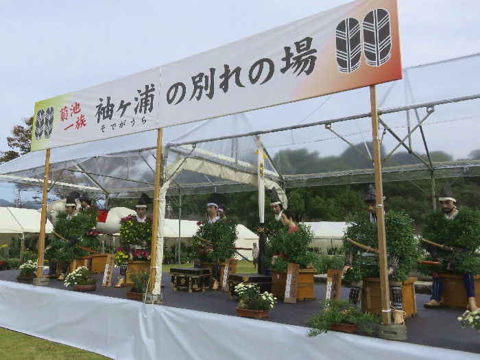 「菊人形・菊まつり」では、かつて九州で活躍した豪族「菊池一族」の武者姿とともに歴史物語を色鮮やかな菊の花で表現をした菊人形が見どころ。菊人形で表現をした「袖ヶ浦の別れの場」がどんな物語なのか案内板があり、菊人形を通じてかつて九州で活躍した豪族「菊池一族」の歴史を知ることもできます。