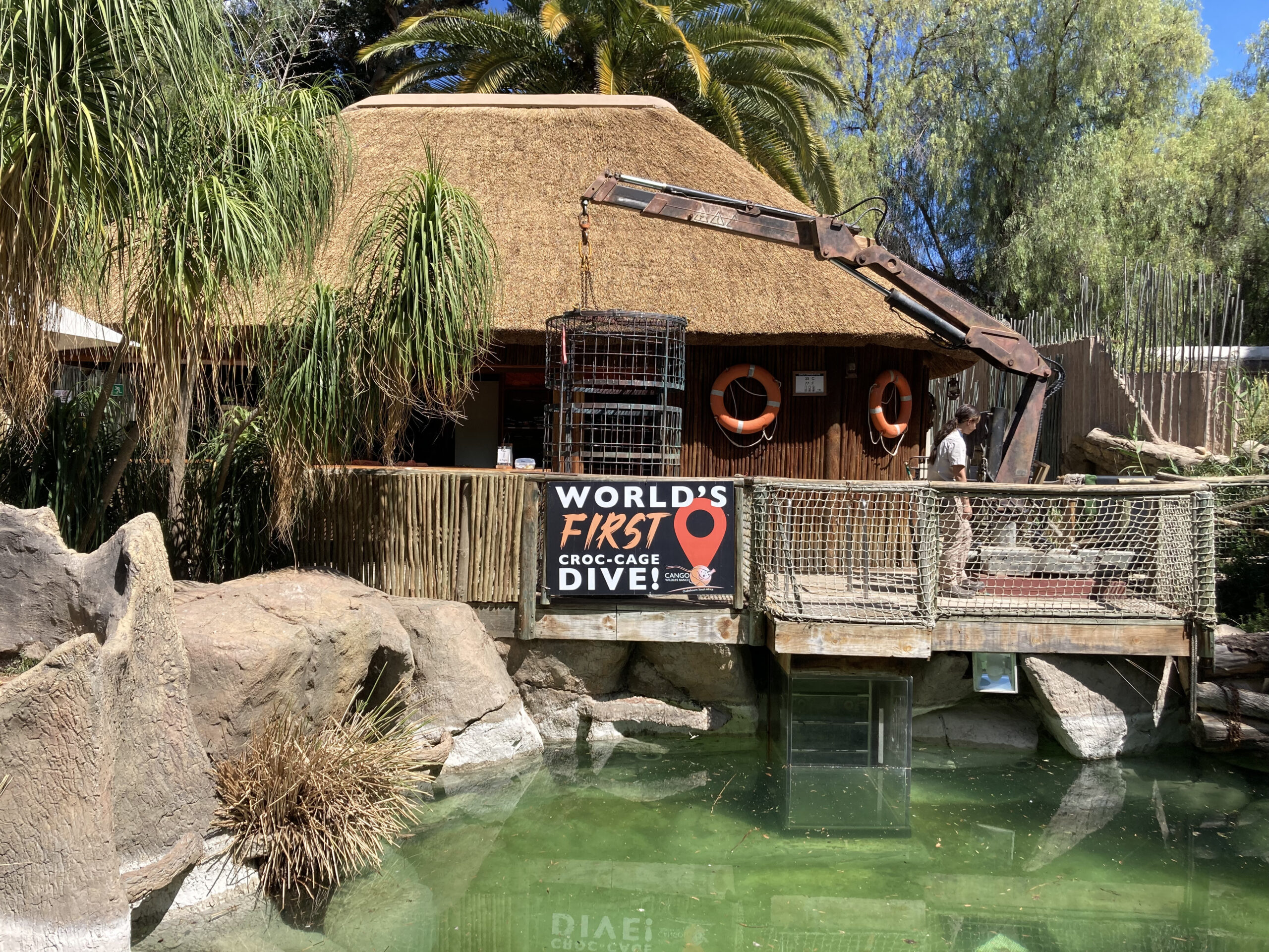 西ケープ州に、オーツホーンというダチョウ産業で栄えた町があります。そのオーツホーンにある動物園、『カンゴー・ワイルドライフ・ランチ』ではクロコダイル・ケージ・ダイブという珍しい体験ができます。ゲストは小さい檻の中に入り、ワニのいる池に檻ごと入水して池の中から間近にワニを観察することができます。体験してみたところ、怖いどころかワニの大ファンになったのでその体験の様子をご紹介します。