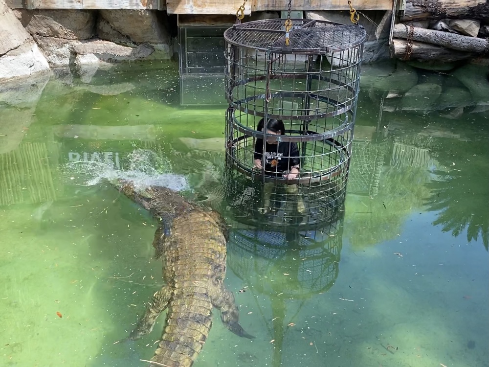 ケージの中に入り、クレーンで吊るされてワニの池に入水します。池は浅く、ゲストの胸のあたりまでしか水に浸からないようになっています。水中のワニの動きを観察したければ、事前に渡されているゴーグルを装着して潜ってもいいのですが、潜らなくても十分見えます。