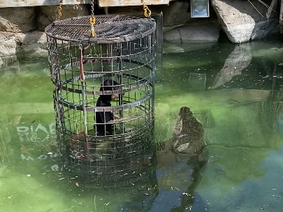 静かに観察していたところ、飼育員さんがいきなり肉の破片を投げ込んでジェイソンくんがキャッチしました。かなりびっくりしました。小粋な演出です。