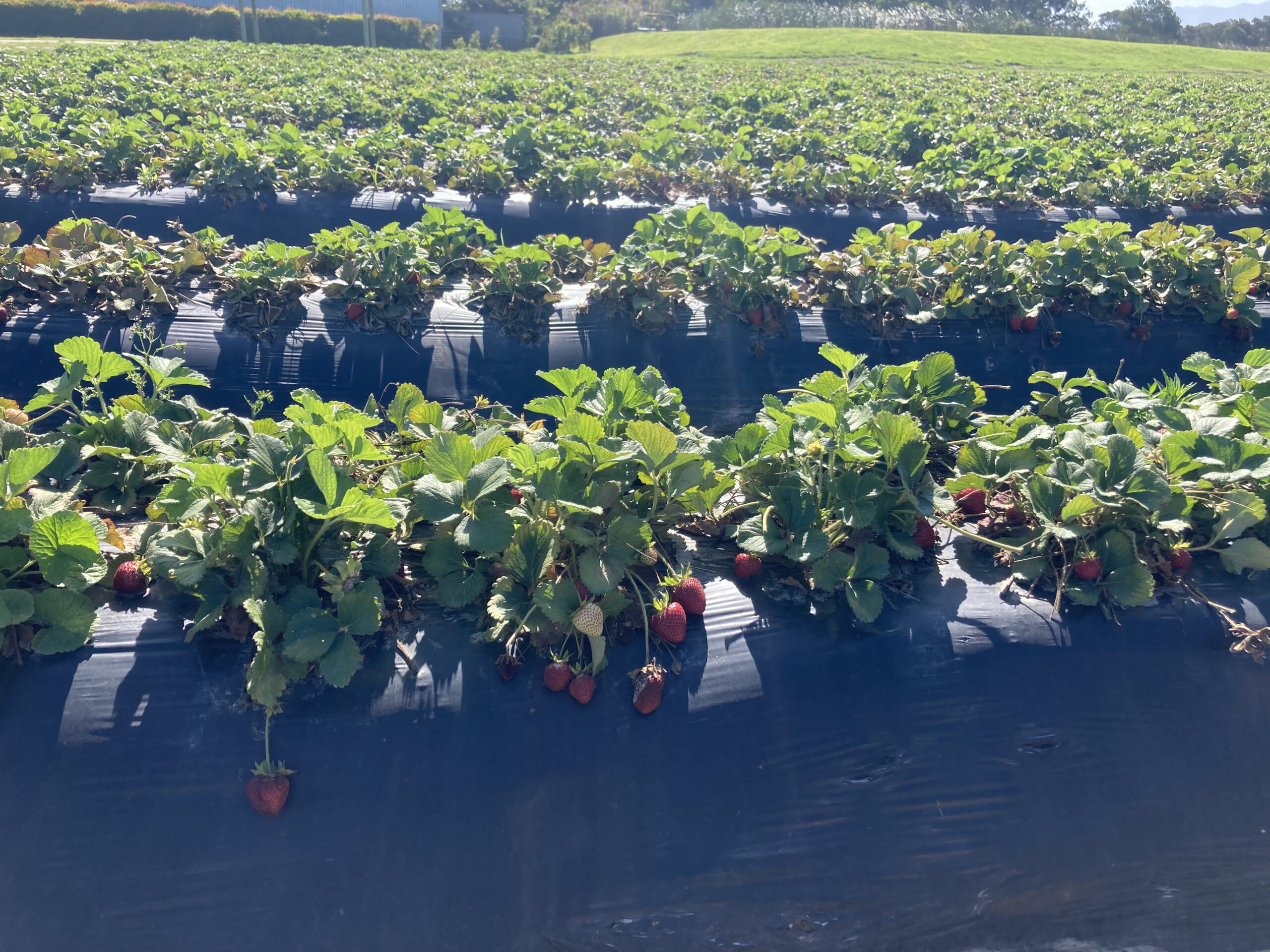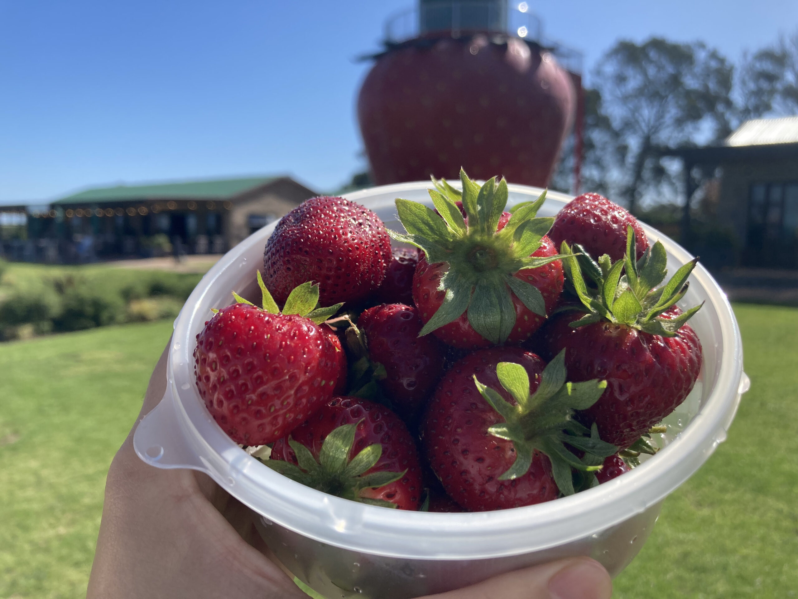 ジョージ空港から車で5分ほどのところに、いちご摘み体験ができるいちご農場『レッドベリーファーム』があります。入場無料で、巨大ないちごのオブジェが目印。