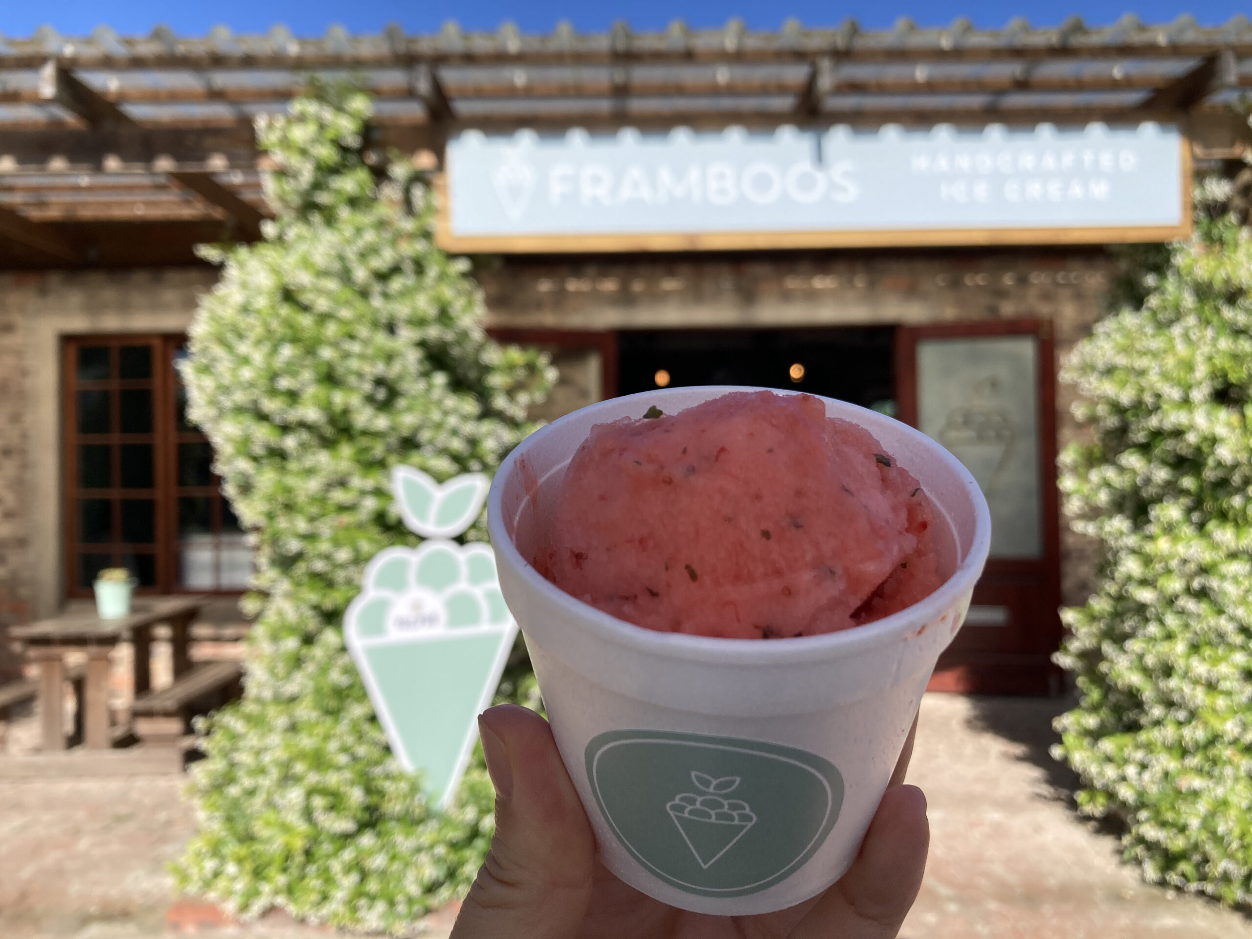 ジェラート屋さんの1番人気はいちごのソルベです。甘すぎず、アクセントにミントが入っていて絶妙な爽快感。暑い夏に食べたくなる一品です。