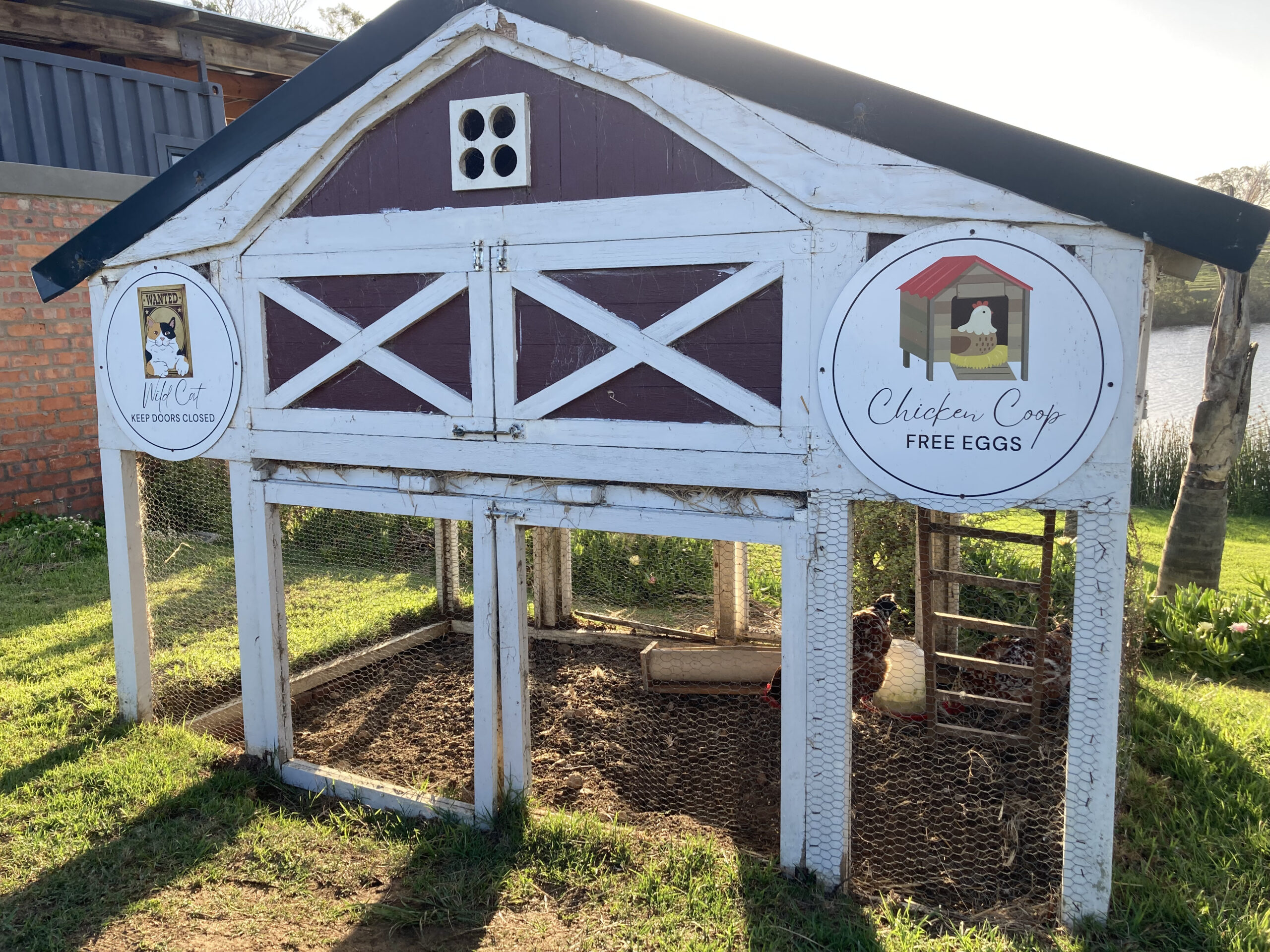 各キャビンのすぐ隣には鶏小屋が設置されています。もしここで卵を見つけたらとって食べて良いことになっています。