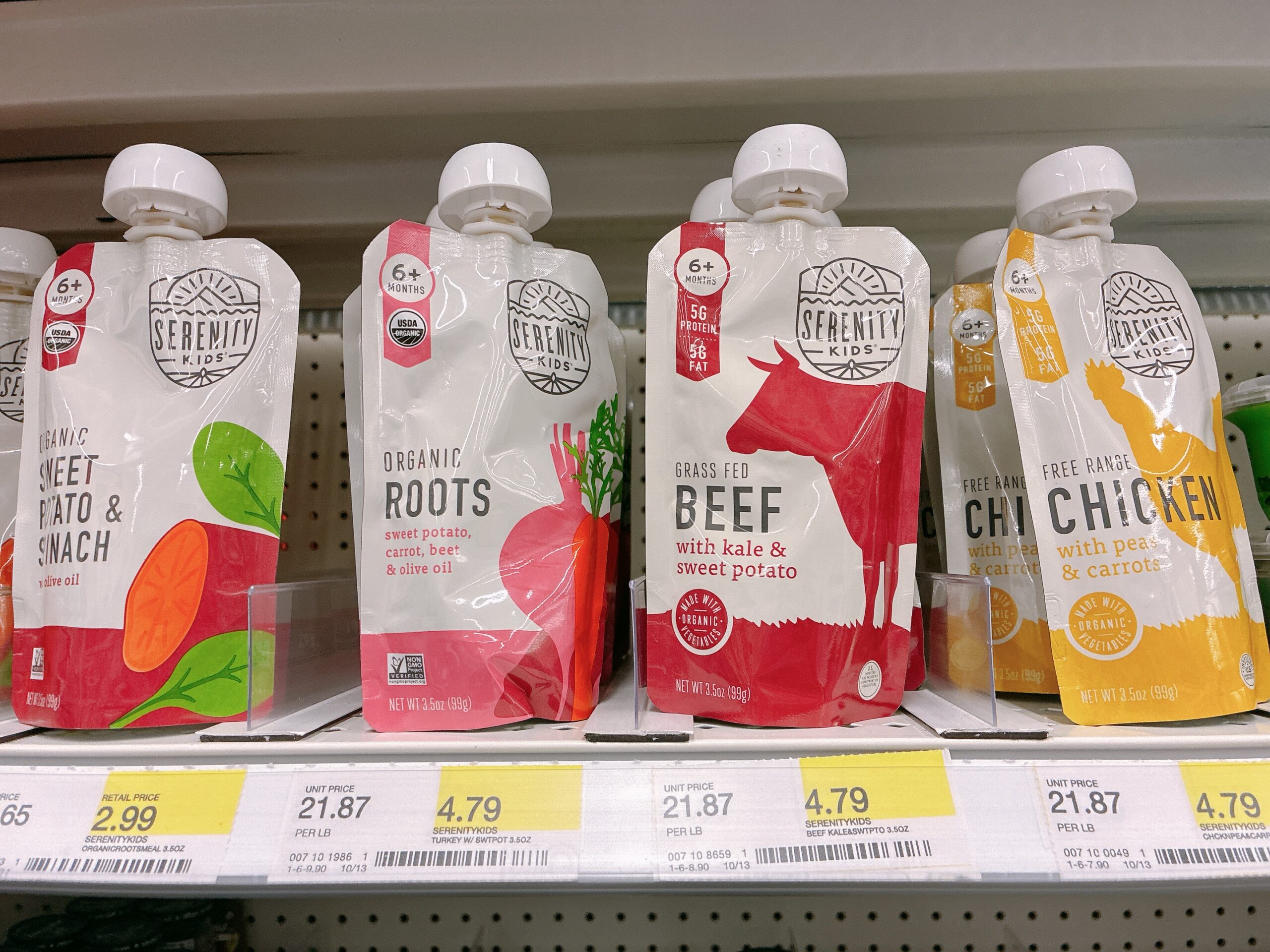 筆者のいちばんのおすすめは、「Serenity Kids」。オーガニック野菜や放牧牛・豚などを使った高品質ベビーフードブランドで、少しお値段は張るものの、アメリカではとても人気があります。特徴は、たんぱく質と野菜が一度にしっかり摂れること。肉・魚・野菜を組み合わせたピュレが中心で、塩分・砂糖・保存料は不使用。旅行中でもしっかりした食事を与えたいときにぴったりです。