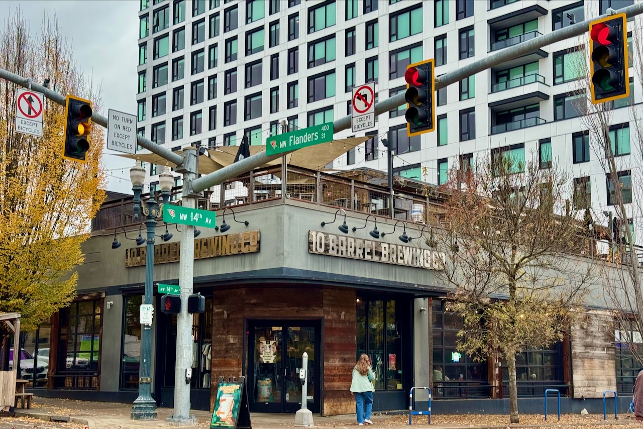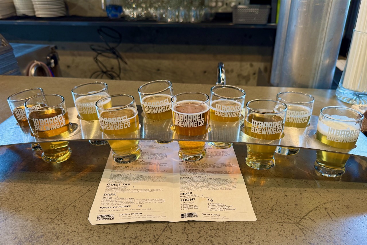 3軒目は、今回のサンプラー巡りで最も“都会の顔”を感じさせてくれた10 バレル・ブルーイング(10 Barrel Brewing)。ここではもちろん、看板メニューである10種類のサンプラー($16)一択(どんだけ飲むんじゃい!)。ステンレストレイにずらりと並んだ10杯は、もはやアートのパレット。午後3時の斜光を受けて透けるアンバーやゴールドのグラデーションは、パールディストリクトの洗練をそのまま液体にしたような眺めだ。