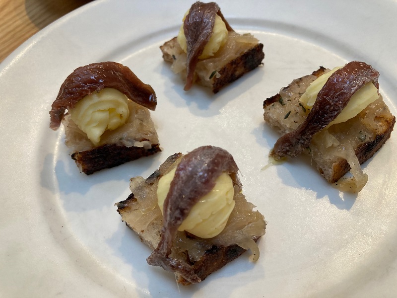 ワインの次に運ばれてきた2品。ひとつは前菜メニューから、スペイン・バスク地方カンタブリア産アンチョビを載せたトースト。もうひとつは小皿メニューから、スコットランド・マル島産チーズを使ったチーズパフ。