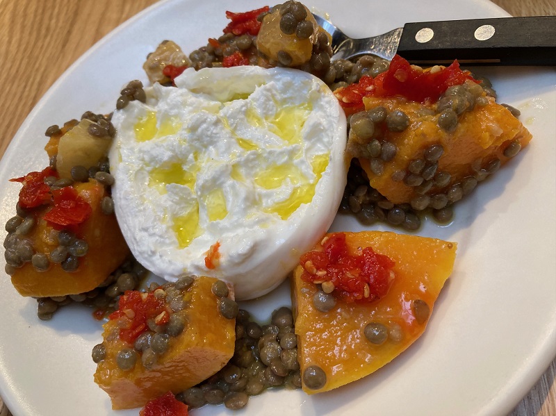 3品目も小皿メニューから、ブーラッタ、カボチャ、レンズ豆とチリ。ちょっと意外な組み合わせだけど味のバランスが良く、新鮮な驚き!