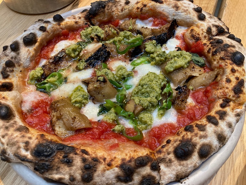 こんがり焼けたサワードウピザ、具はナスとグリーンホーンペパー、オリーヴ入りグレモラータソースという絶妙な組み合わせ。