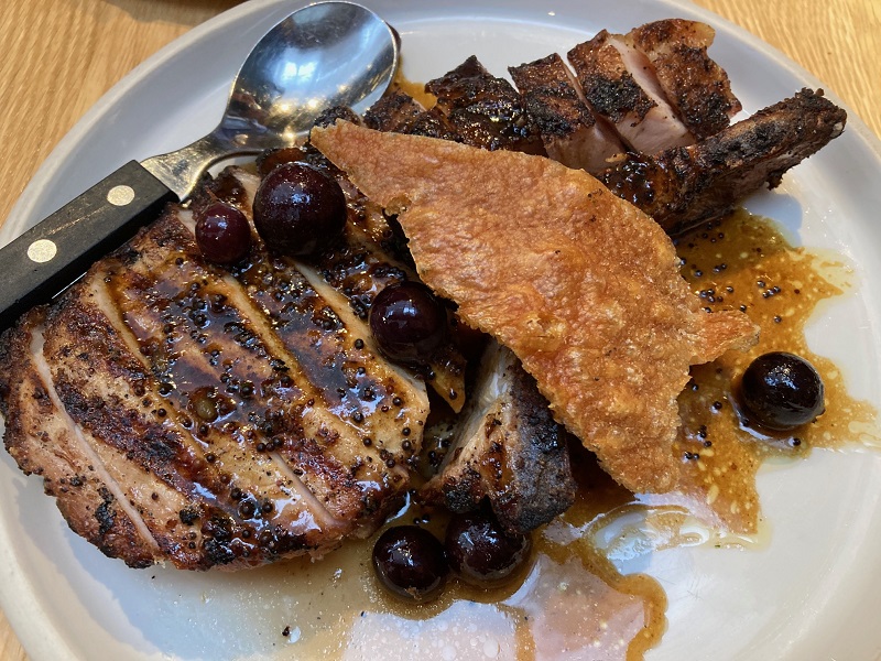 そしてメインで登場したのが、薪窯で香ばしく焼いたポークチョップ。丸いチェリーみたいに見えるのはブドウのピクルスで、リンゴ酢とともに美味しいソースになっていました。お肉もカリカリの皮も、ほんとに美味。