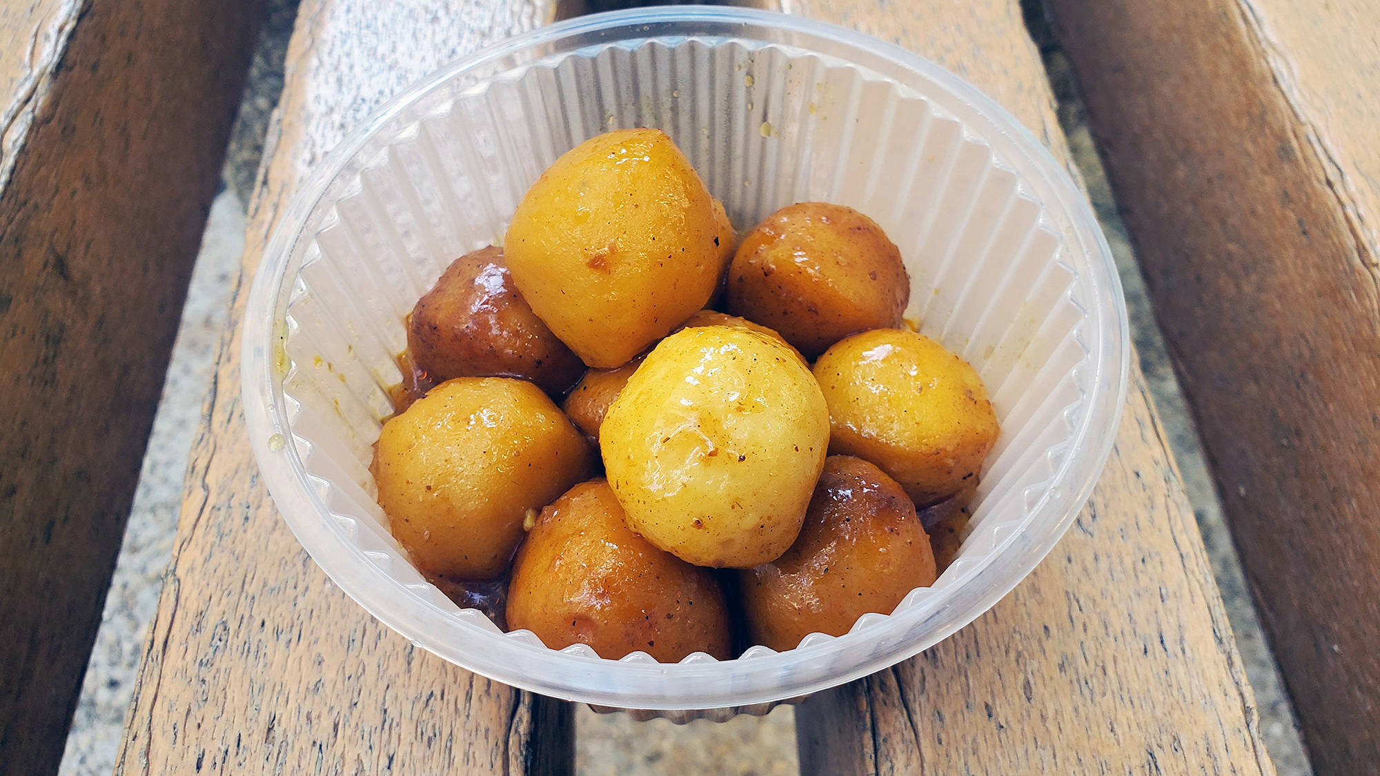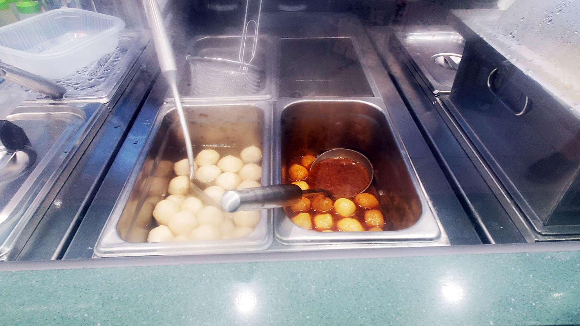 香港らしいのは、点心文化があるということで、「焼売」(10個18香港ドル)、「魚蛋」(魚の団子でカレー味。10個18香港ドル)、「墨魚丸(イカの団子。6個18香港ドル)」というのがあります。焼売は日本でも人気ですが、魚蛋はカレー味ということで、日本ではなかなか立食べられる機会はありません。魚のつみれにソース状にしたカレーがかかっているのですが、カレー味なので気軽に食べられます。