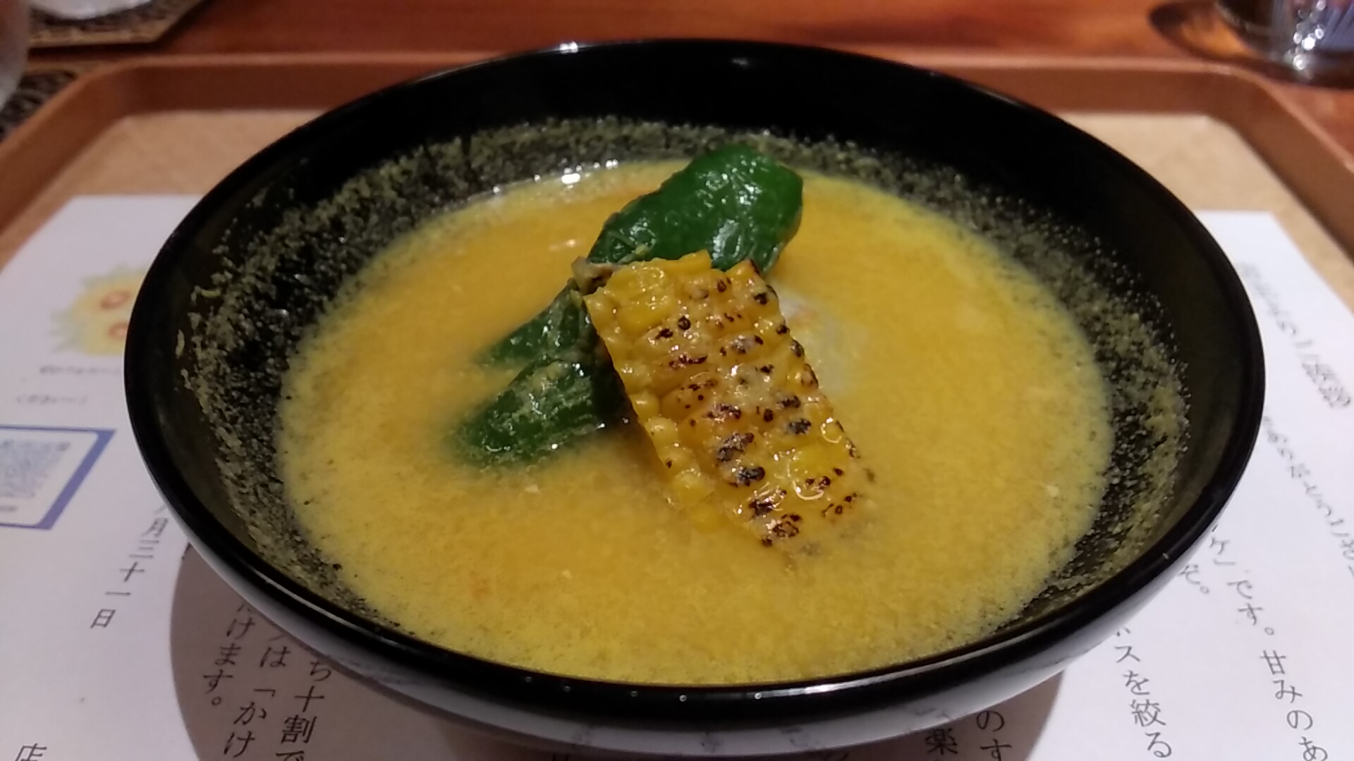 そばがきは、こちらのお店自慢の料理ですが、この時(8月に訪問)は夏らしく、「とうもろこし」のすり流しに入っていました。