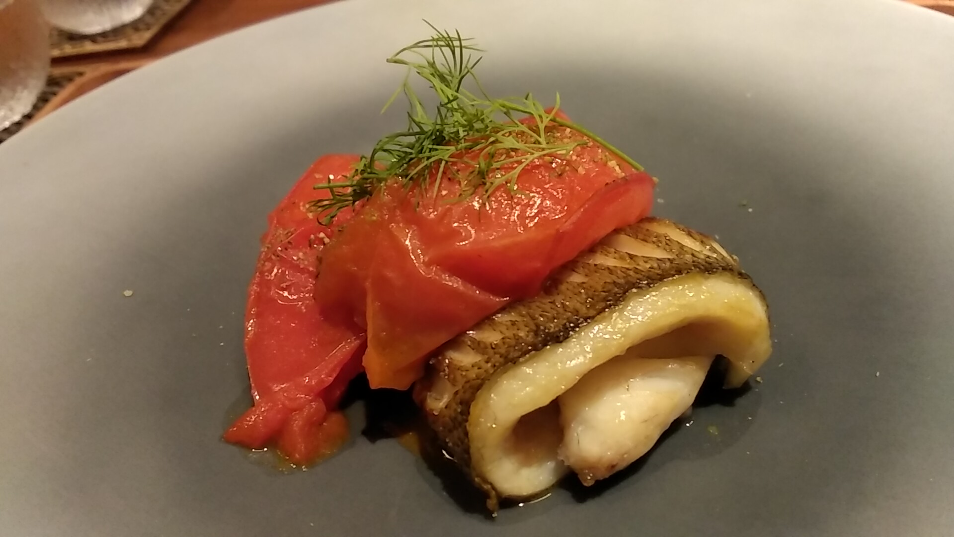 ふんわりと焼き上げたカマスに、旨味の強い焼きトマトを合わせています。