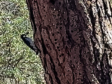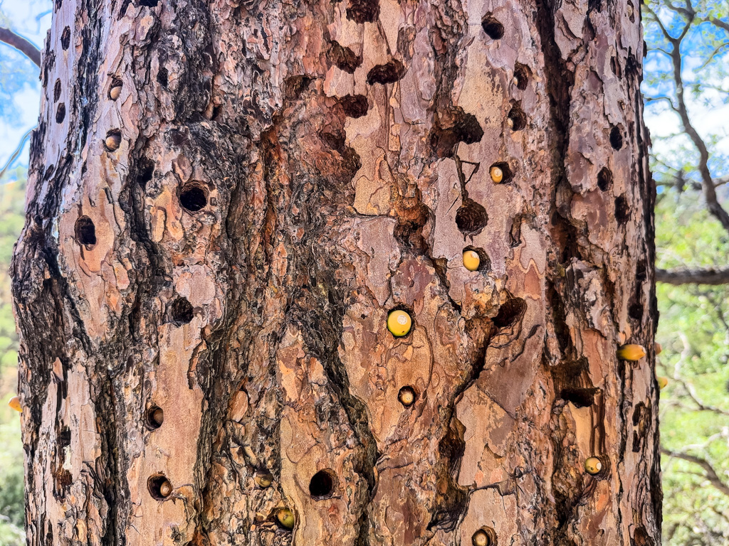 途中の松の木にはキツツキがたくさんいて、虫を食べた穴に冬の食料のドングリを蓄えていました。
