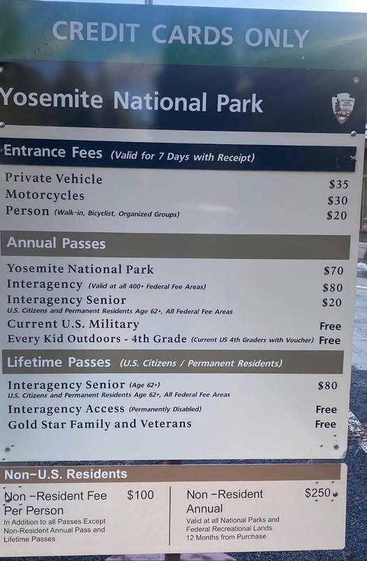 1月07日にRodney Ninowさんが、Facebookの”Yosemite Turing information“グループに投稿した情報です。米国の居住者と一緒に行った非居住者2名が一人$100を請求されたので引き返してきたとのコメントがありました。