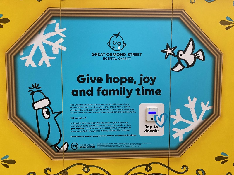 この黄色いオルゴール型ツリーは、グレートオーモンドストリート病院(Geat Ormond Street Hospital)への支援を呼び掛けるもの。