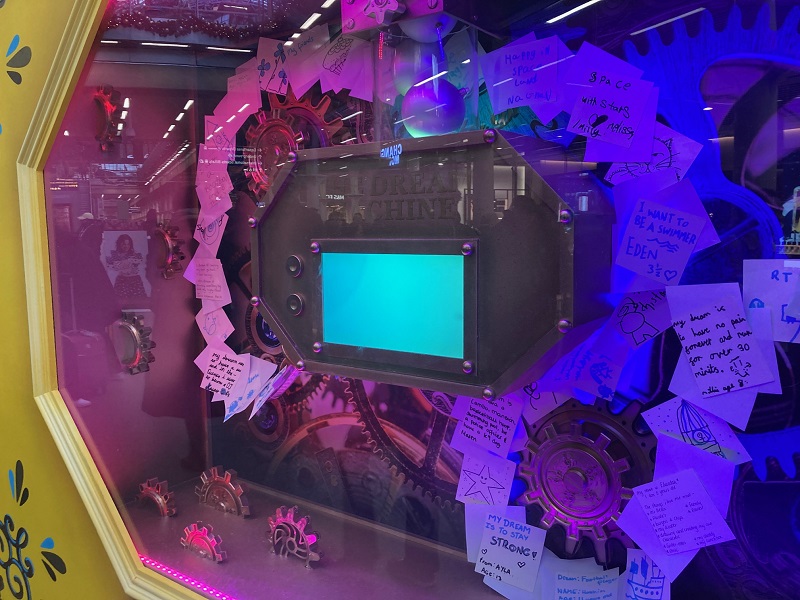 ツリーには、この病院へ寄付するためのタッチ式カード読み取り機やセルフィースポット、そして夢のタイムマシンも。そのボタンを押すと、闘病中の子供たちが無事に成長しそれぞれの夢を叶えるようにという願いを込めて、タイムマシンが虹色に変わります。