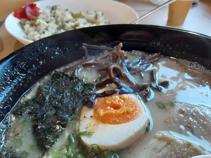 実は、ラーメンを食べるぞ!! と意気込んでいた割にギトギトの豚骨スープと香りが苦手なワタクシ。まずは、ドキドキしながらスープをごくり。一口目の濃い味わいにガツン!! 思わず「うまッ」と言葉が出てしまうぐらいおいしいなぁと感じました。
