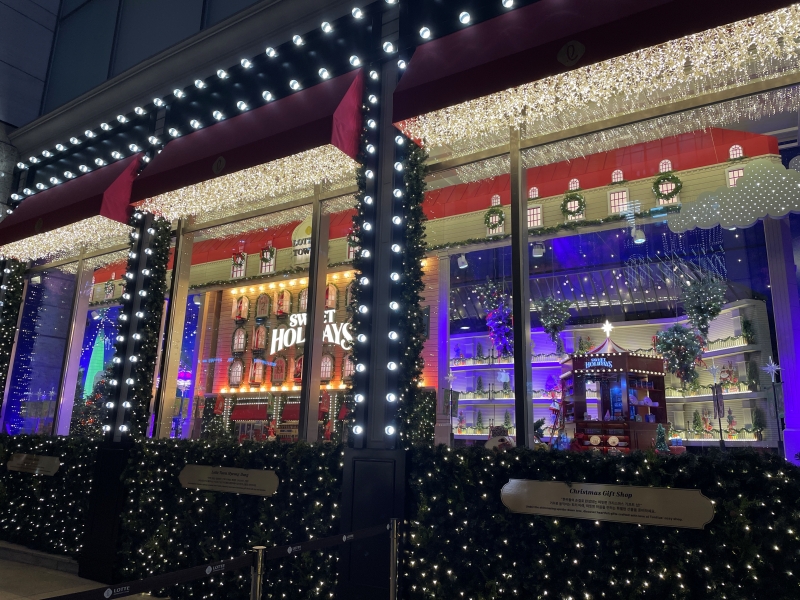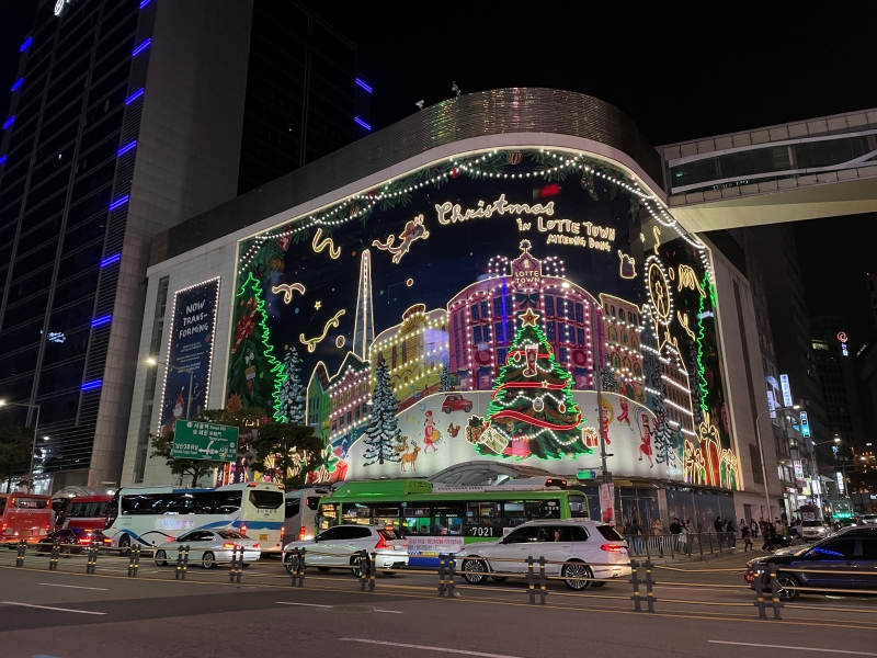 ロッテヤングプラザの隣にあるのが、ロッテ百貨店本店です。こちらも建物の外壁を利用したイルミネーションです。ショーウィンドウにはかわいらしいクリスマスの模型があるので、ぜひ覗いてみてください。