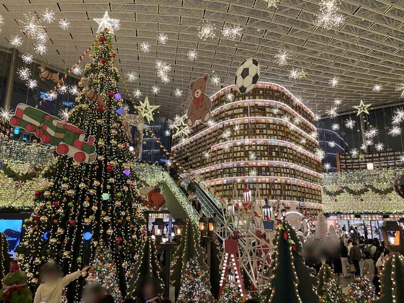 大きなコンベンションセンターとショッピングモールのある三成(サムソン)エリア。COEXモールにあるピョルマダン図書館のクリスマスイベントがとても華やかだと話題です。本の中から広がるクリスマスをテーマにメリーゴーランドやスノードームなどのフォトスポットがありました。エスカレーターを上り、上から見ても美しいです。屋内ですが入場予約が必要なく、暖かく楽しめるので、おすすめです。