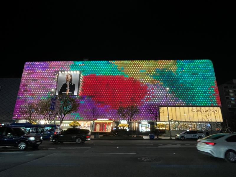 新世界百貨店本店から乙支路入口駅方面に向かうと、ロッテヤングプラザあります。現在は改装中で入ることはできませんが、外壁のイルミネーションがきれいですので、ぜひ見てみてください。