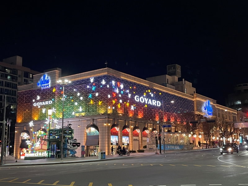 三成エリアより北に位置する狎鴎亭(アックジョン)エリアは高級ブランドやショップが建ち並ぶ場所です。狎鷗亭ロデオ駅を出ると、ギャラリア百貨店 名品館(EAST、WEST)の建物が見えます。有名ブランドとコラボしたライトアップでEASTはツリーや星などクリスマスらしいスタイル、WESTは色鮮やかでおしゃれなライトアップになっています。