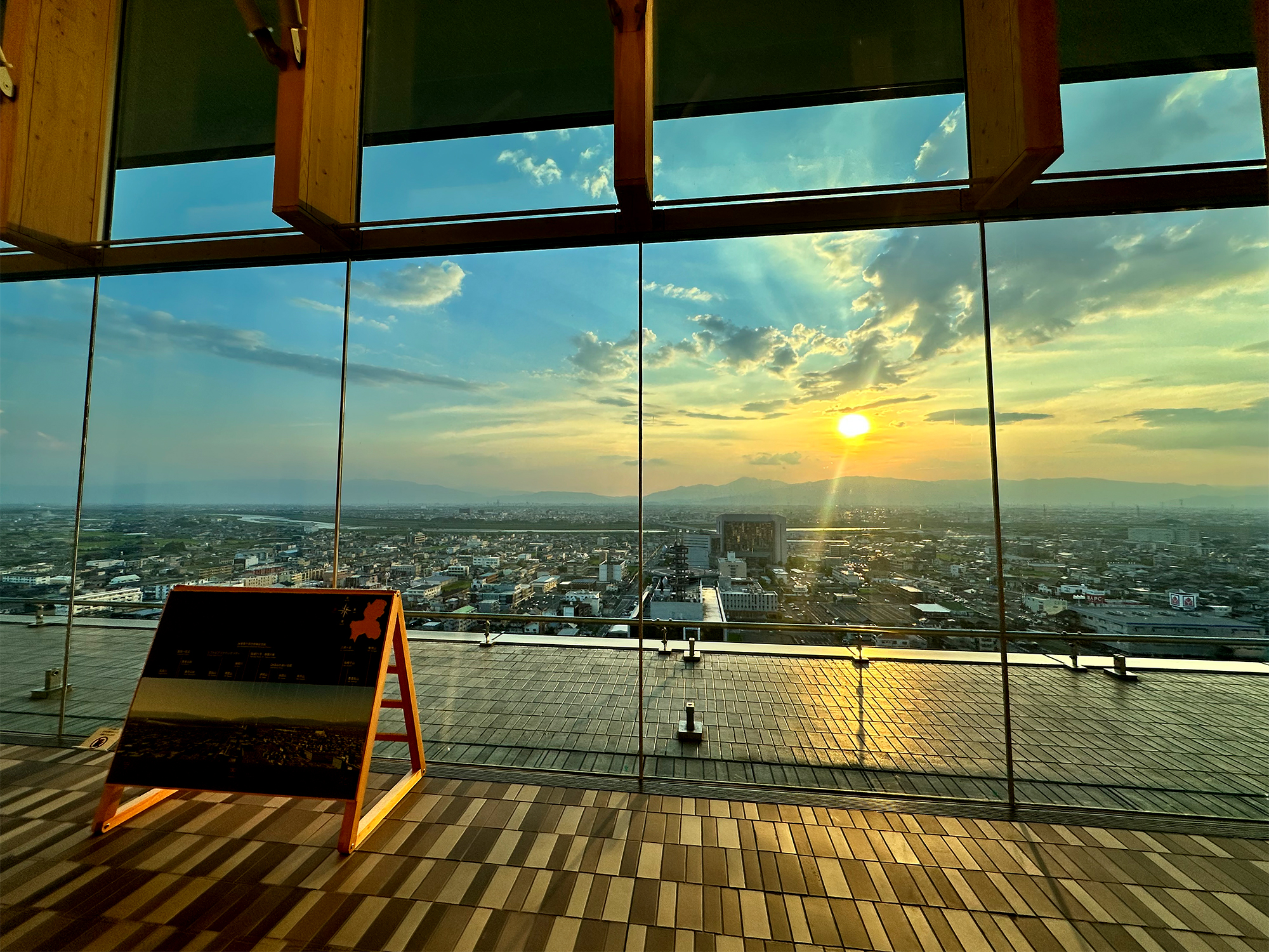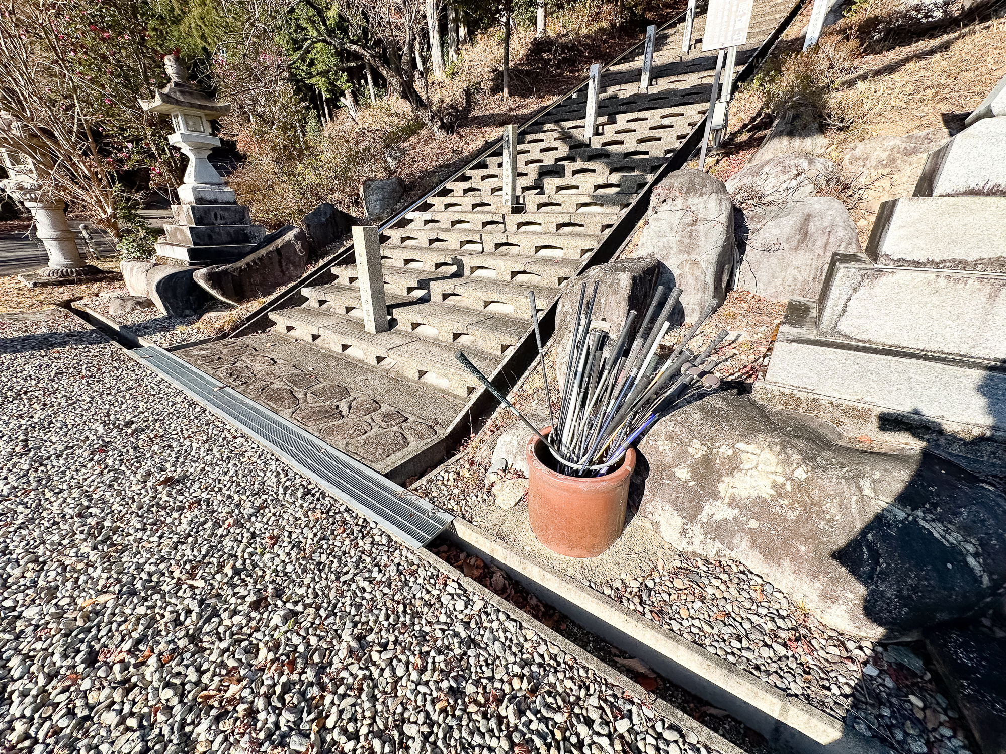 鳥居から続く長い階段を、休み休み上っていきます。途中には「快晴の日には振り向けば名古屋方面が望めます」と書かれた立札が。快晴の日だったのですが、あいにく逆光だったのか、残念ながらこの日は見えませんでした。