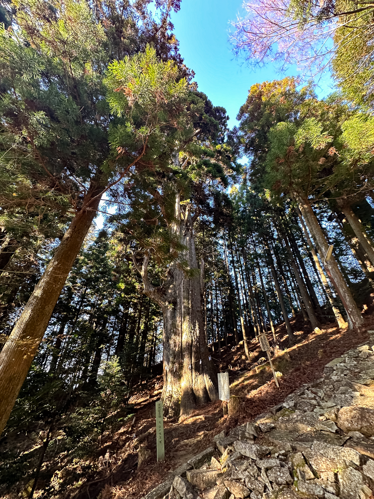 階段の途中には、国の天然記念物に指定されている大杉があります。樹齢1200年以上といわれるその姿は圧巻。幹周りはなんと8.9メートルもあるのだとか。
