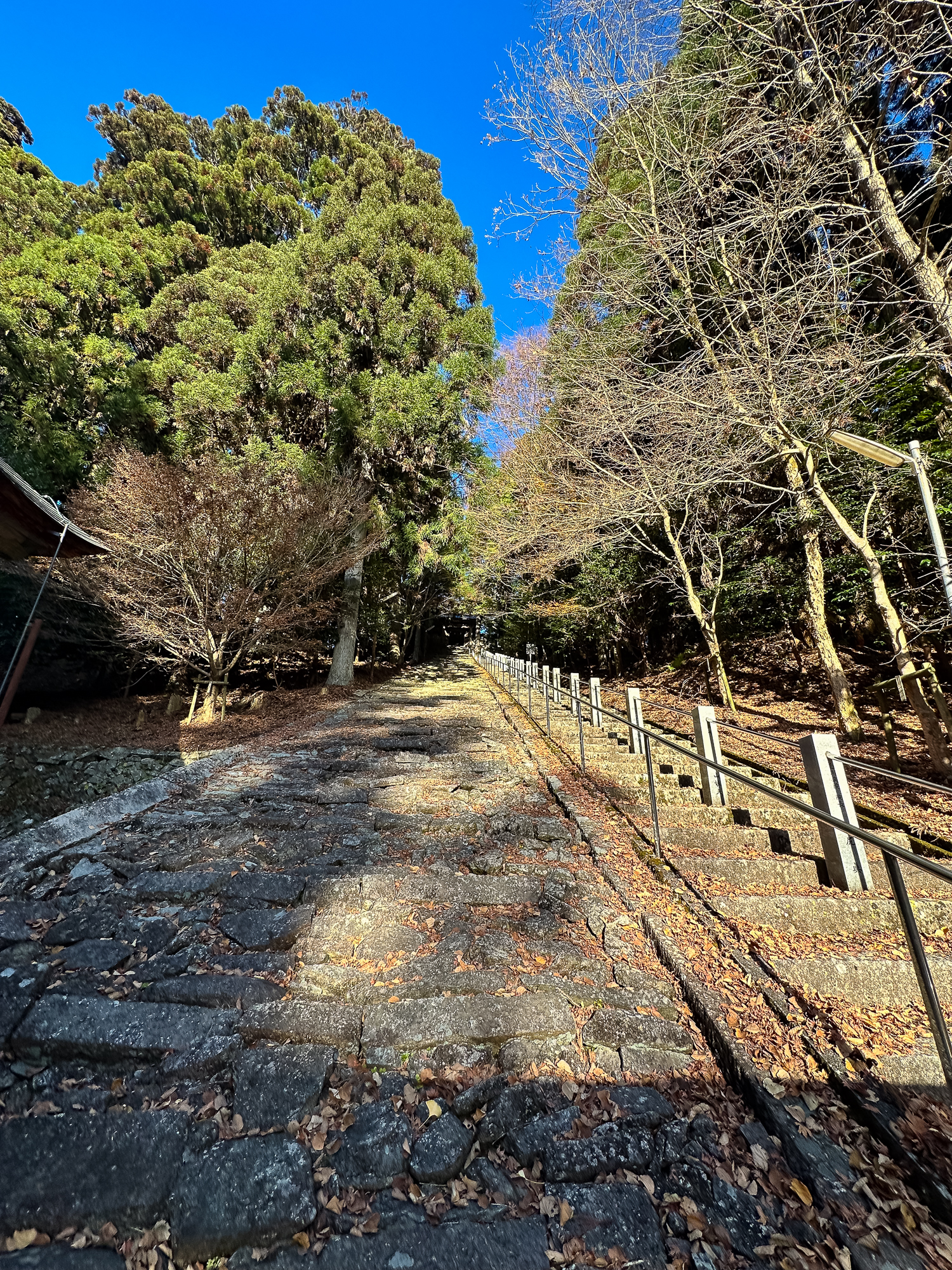拝殿の奥からさらに奥の院へ向かう道は、鬱蒼とした木々に囲まれた石段が続きます。歩きやすいよう、手すりが設置されているのがありがたいところ。石段自体は白川町指定有形文化財で、歴史を感じさせる趣があります。まさか崩してしまうようなことはないと思いつつ、念のため脇に作られた階段を歩かせてもらいました。こちらの方が歩きやすいですし。