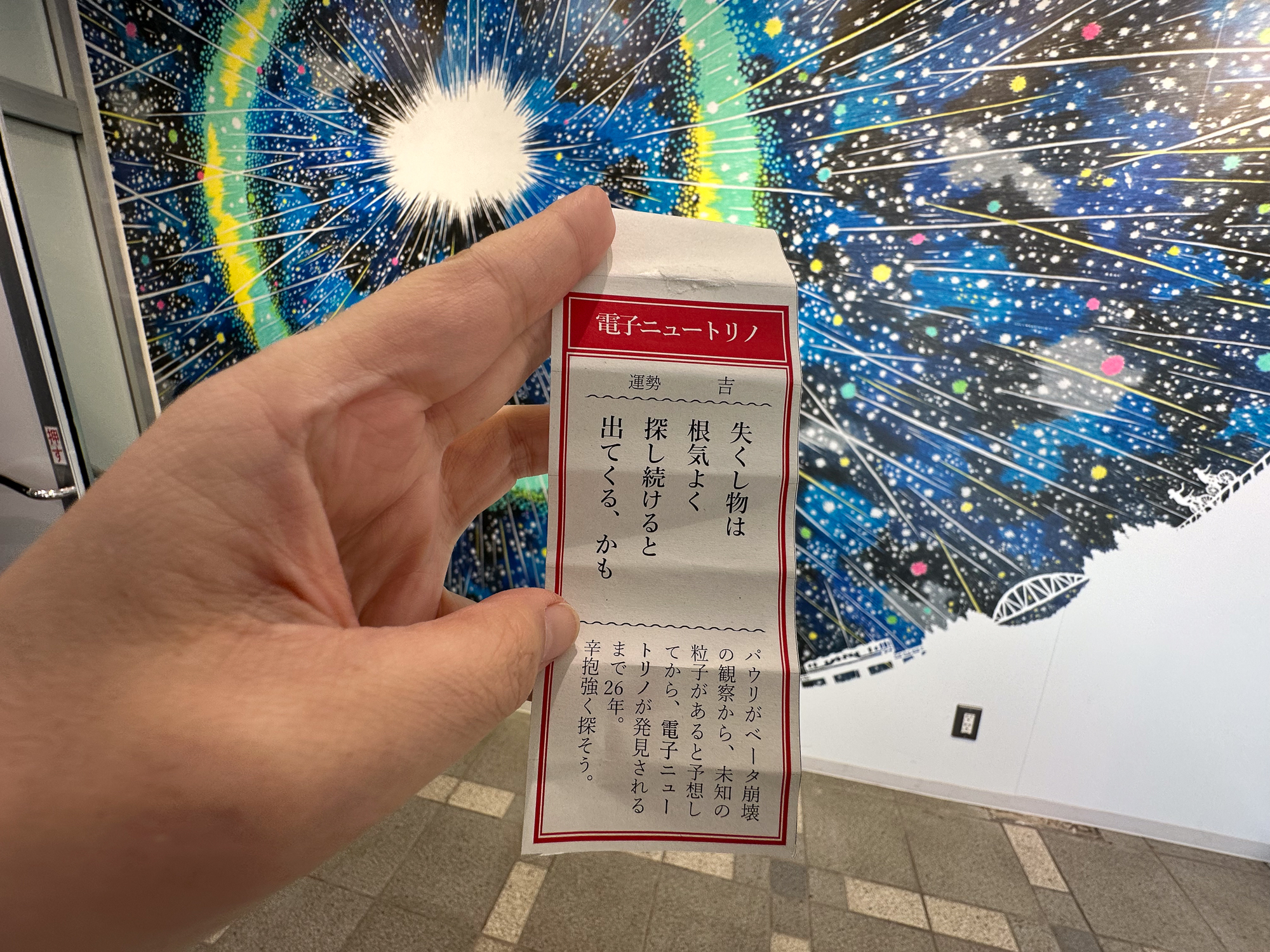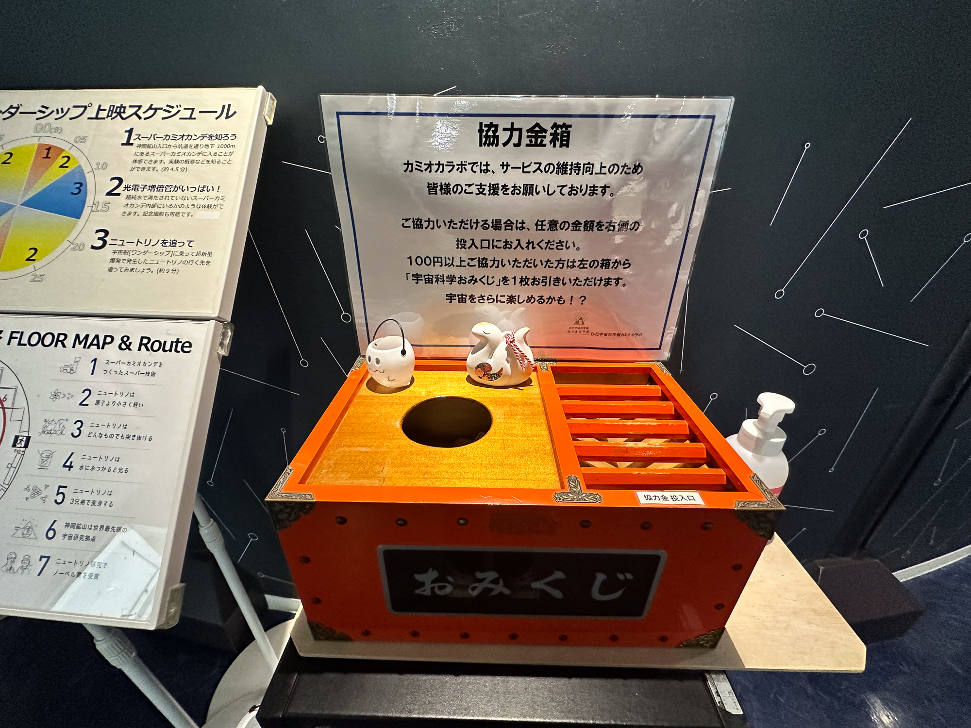 入場は無料ですが、サービス維持向上のための協力金として「おみくじ箱」が設置されており、100円以上の協力でユニークな「宇宙科学おみくじ」を引くことができます。