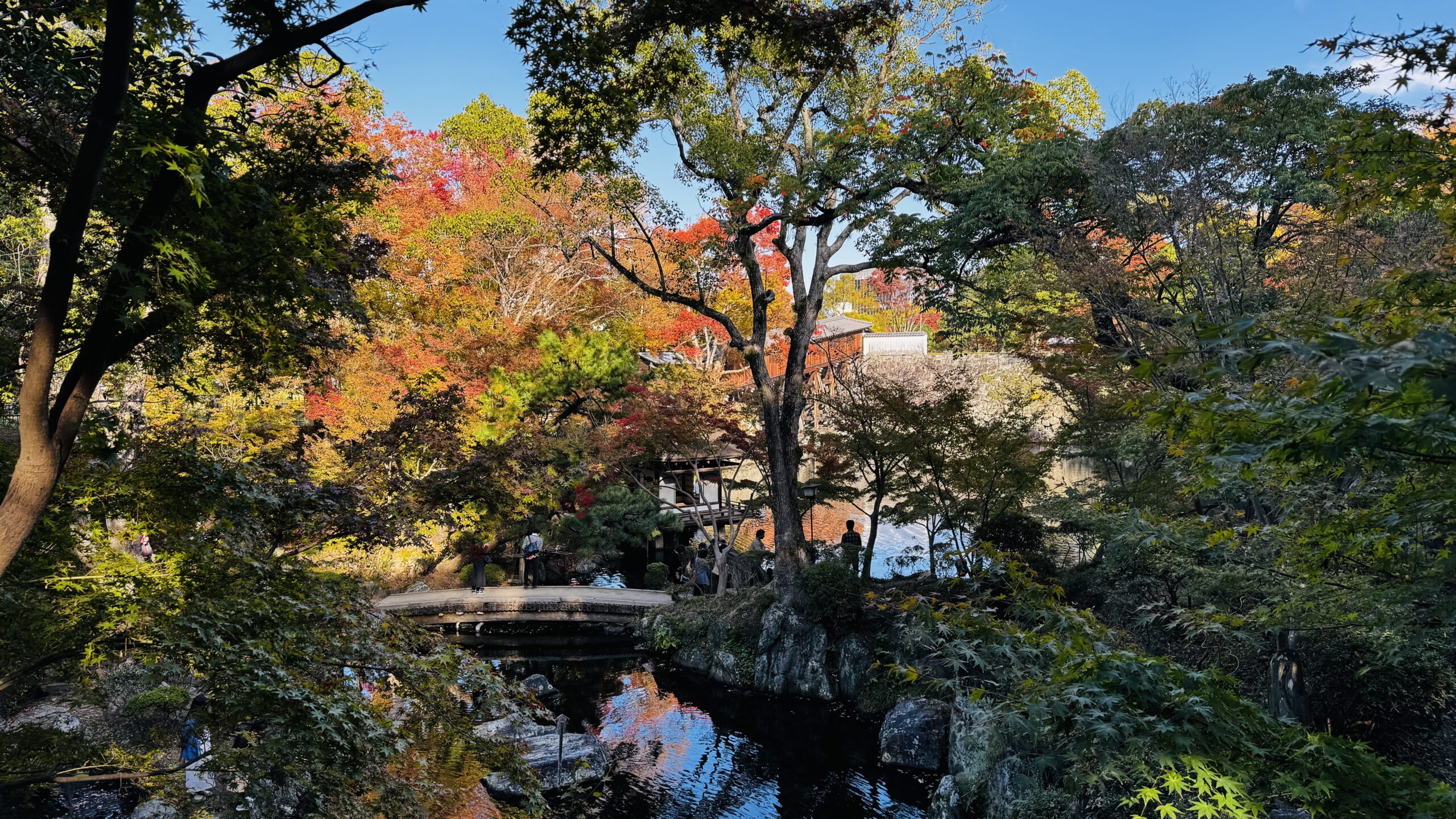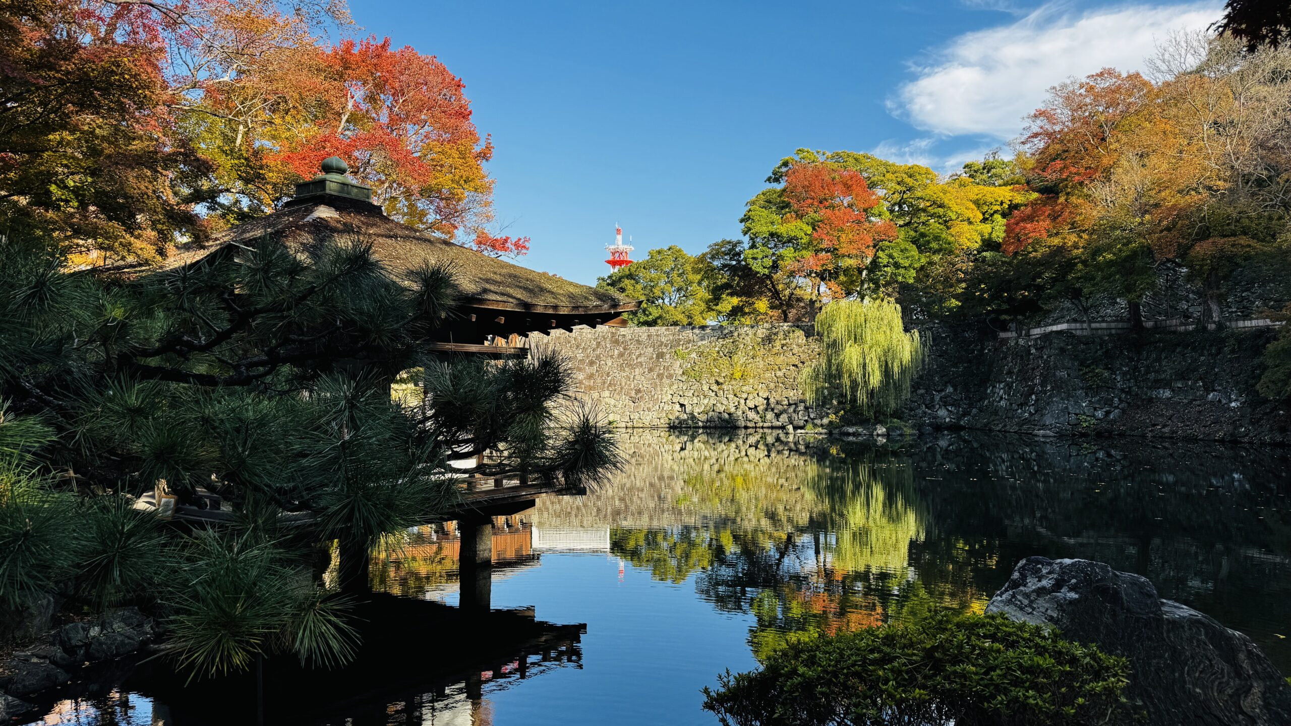 初めての和歌山城です。お天気も良くてまさに秋晴れ。和歌山城は和歌山市の中心にあるお城で、紀州徳川家ゆかりの名所。この日は西の丸庭園を中心に歩いてみました。池泉回遊式の庭園の木々が紅葉していて美しい!と思ったら、紅葉の名所だそうです。木造の屋根付き橋がそのまま長い廊下になっている御橋廊下にも歴史を感じました。
